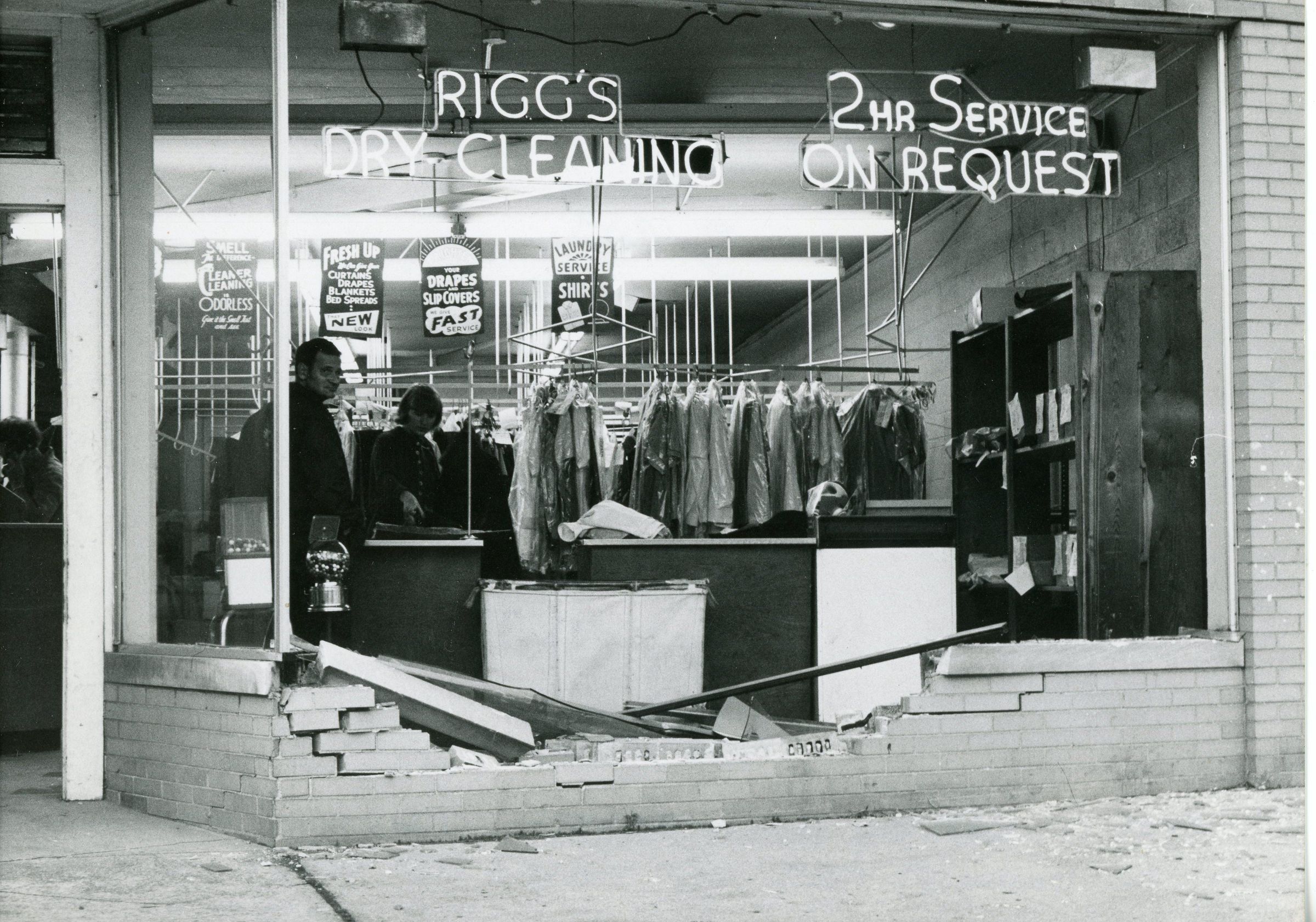 Riggs Dry Cleaning. Oct 1, 1970. Eagle Photo. Car owned by Dug Meyers, teacher at WMHS. Parked car on Wayne Rd., kids took car off park, car rolled and struck the building.Cataloged By