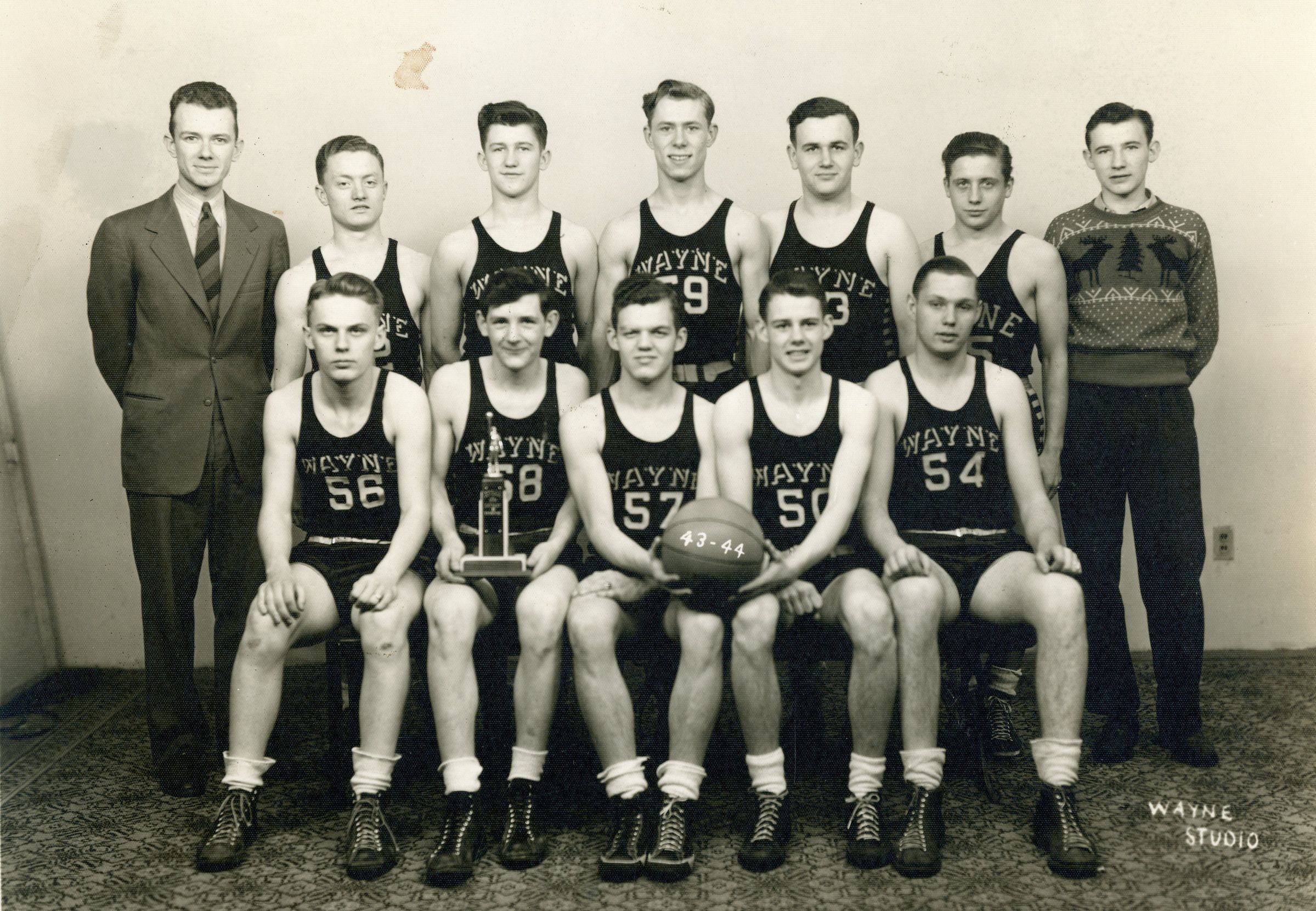 Wayne High School 1934-1935 Basketball State District Champions and Regional Finalist. Front Row L to R: Bob Bills, William Moers, Jim Leright, Chuck Proctor and Garth White. Back Standing Row L to R: Coach Dale Butler, Chuck Brown, Norm Gomolak, Bill Terry, Frank Johnson, Don Leppala and MGR Herb M.Cataloged By