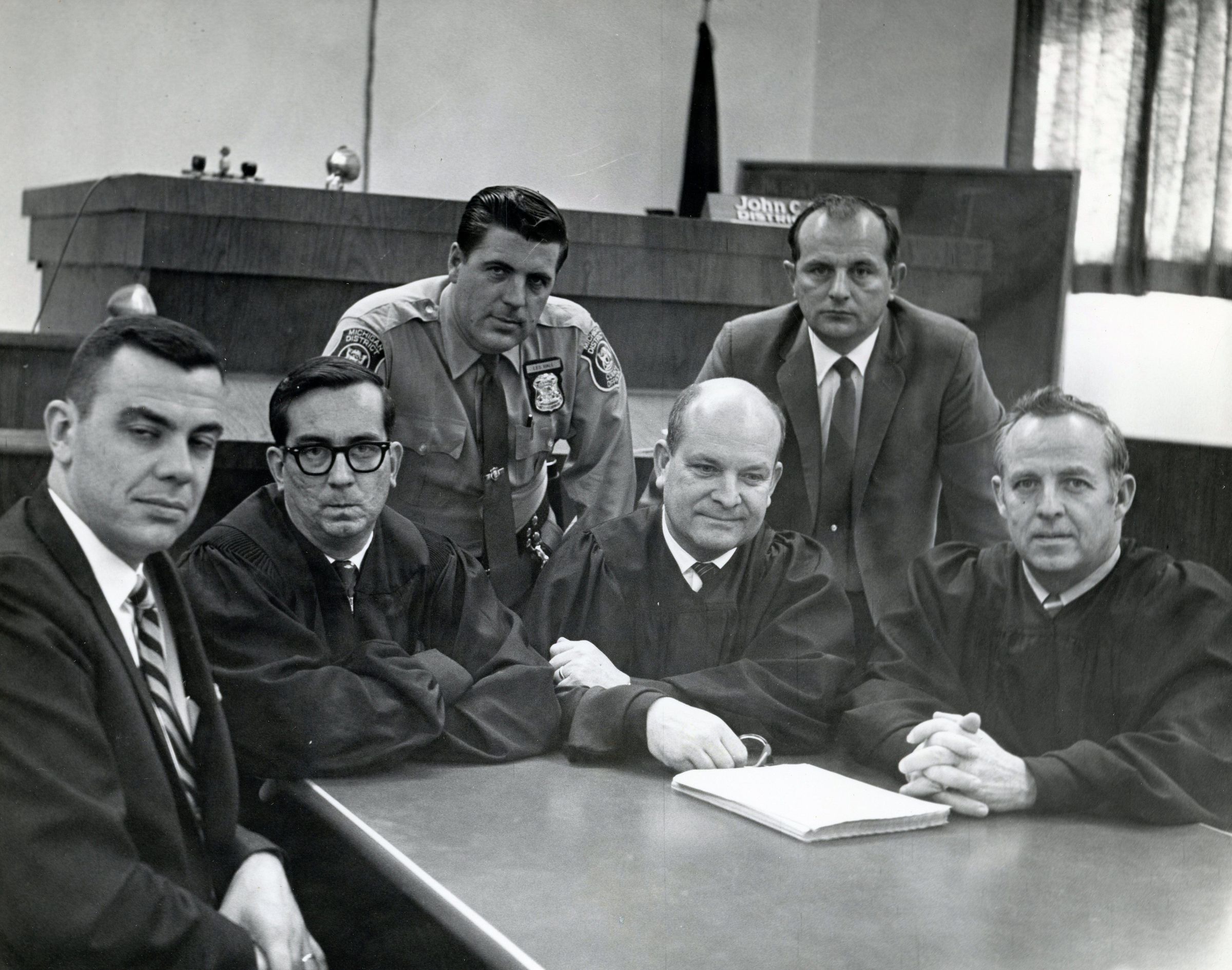 Judge Seiler Court Room. Formation of Driver Improvement School. James Lombard, Judge Thomas B. Smith, Judge John C. Seiler, Judge James B. Stone. Standing: Les Hall, Edward KaneCataloged By