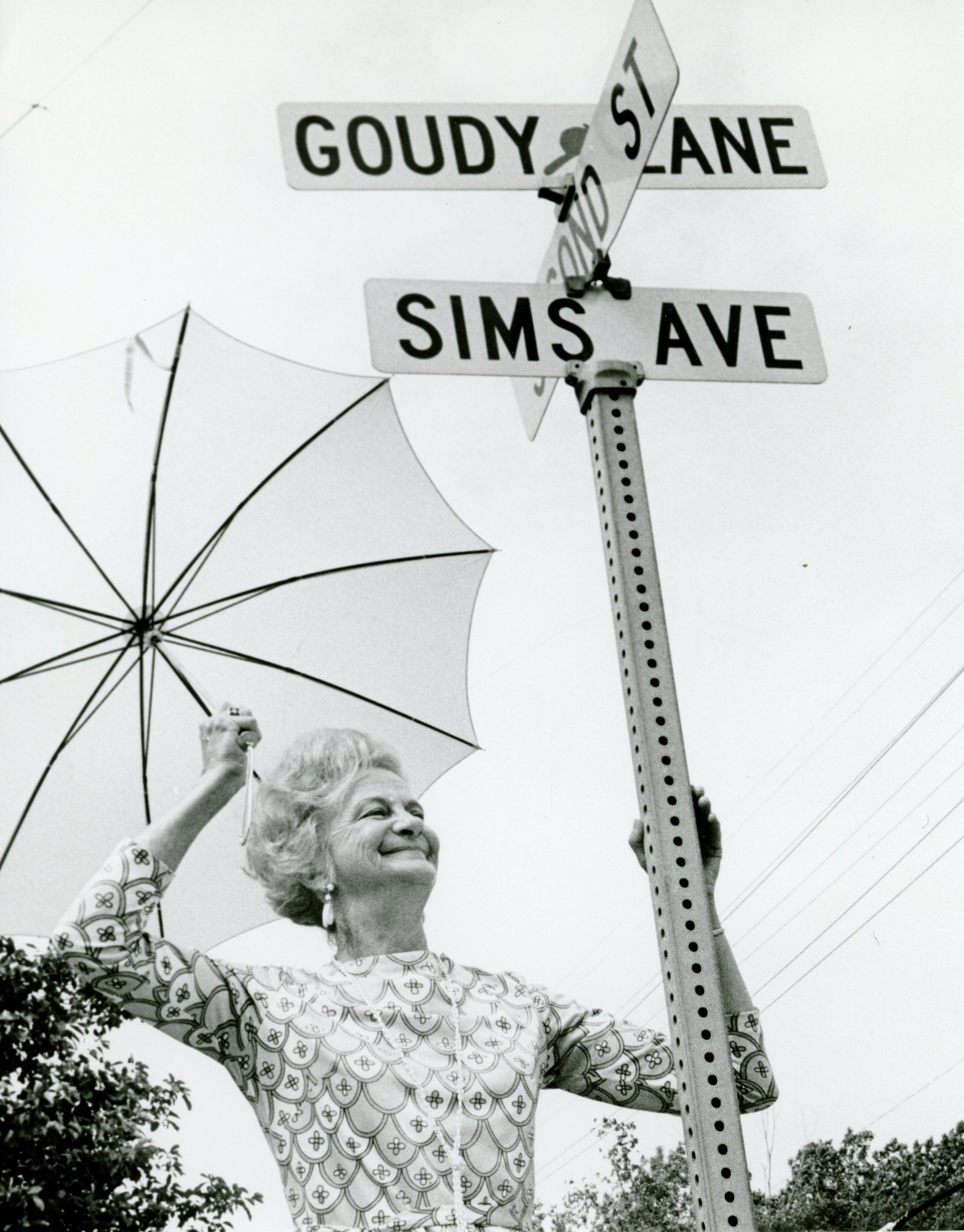 Goudy lane, Sims Street, Second Street. Lela Brown with umbrella. July 1972