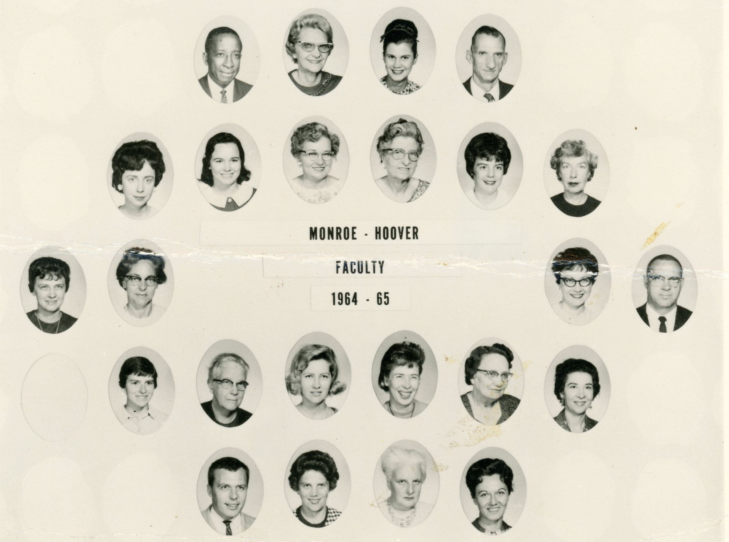 Monroe Hoover Faculty 1964-65. (L-R) James Nelms, Alice Barnhill, UK, George Adams, Arlene Krugler, UK, Mildred Harris, Sue Warren, UK, Redman, Mary Pearce, Bernice Douma, Dorothy Ginski, Lou Green, Jane Cass, Sarah Bird, Goldsmith, Ruth Hargrave, UK, UK, Shoultz, Beverly Lambert, Muriel Tuttle, Mabel LoganCataloged By
