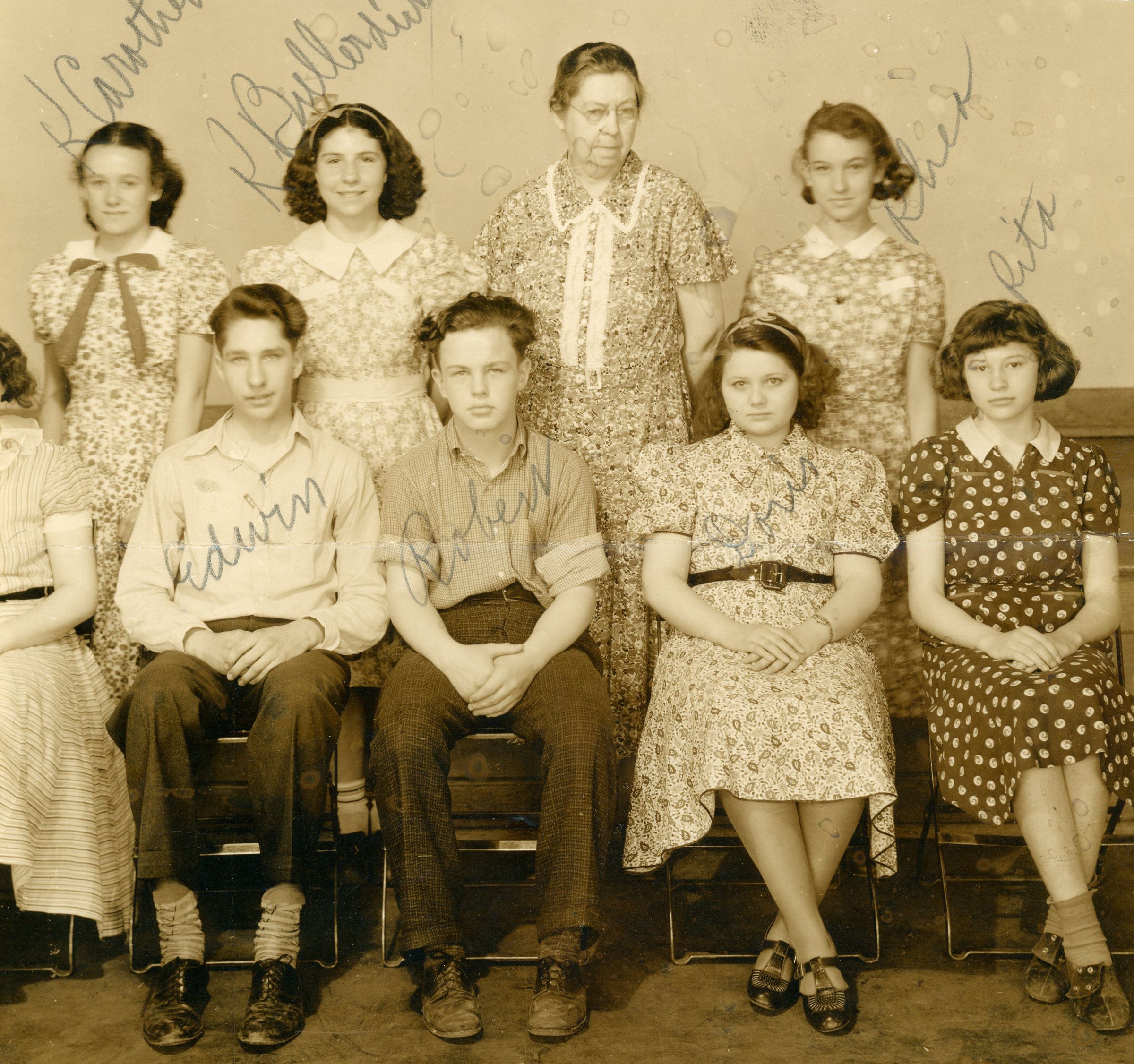Norris School 1939. Back Row: K. Carothers, K. Bullerdick, UK, Rhea Costello. Front: Cora Johnson, Edwin Deo, Robert Squires, Doris Hammond, Rita Meagher