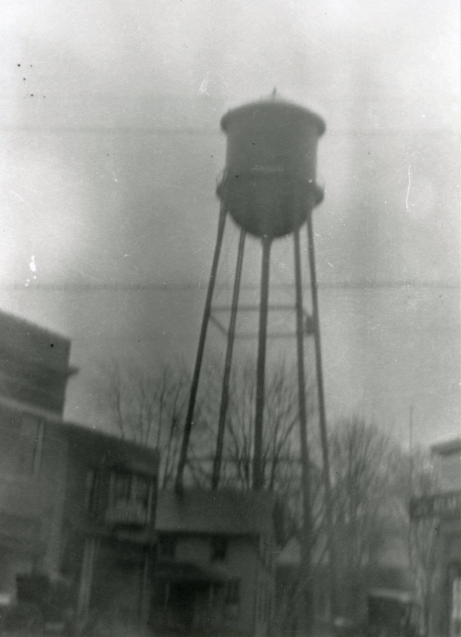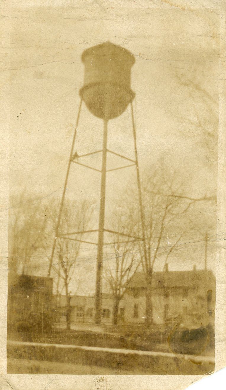 Water Tower was built next to Village Hall in 1913. The two story building was Anne Hazelbock Shoe Store, she and her son lived upstairs. Later it was Ben Bathers barber Shop and Joe Coppola lived upstairs. The next building was Harmon Kingsley Appliance Store.