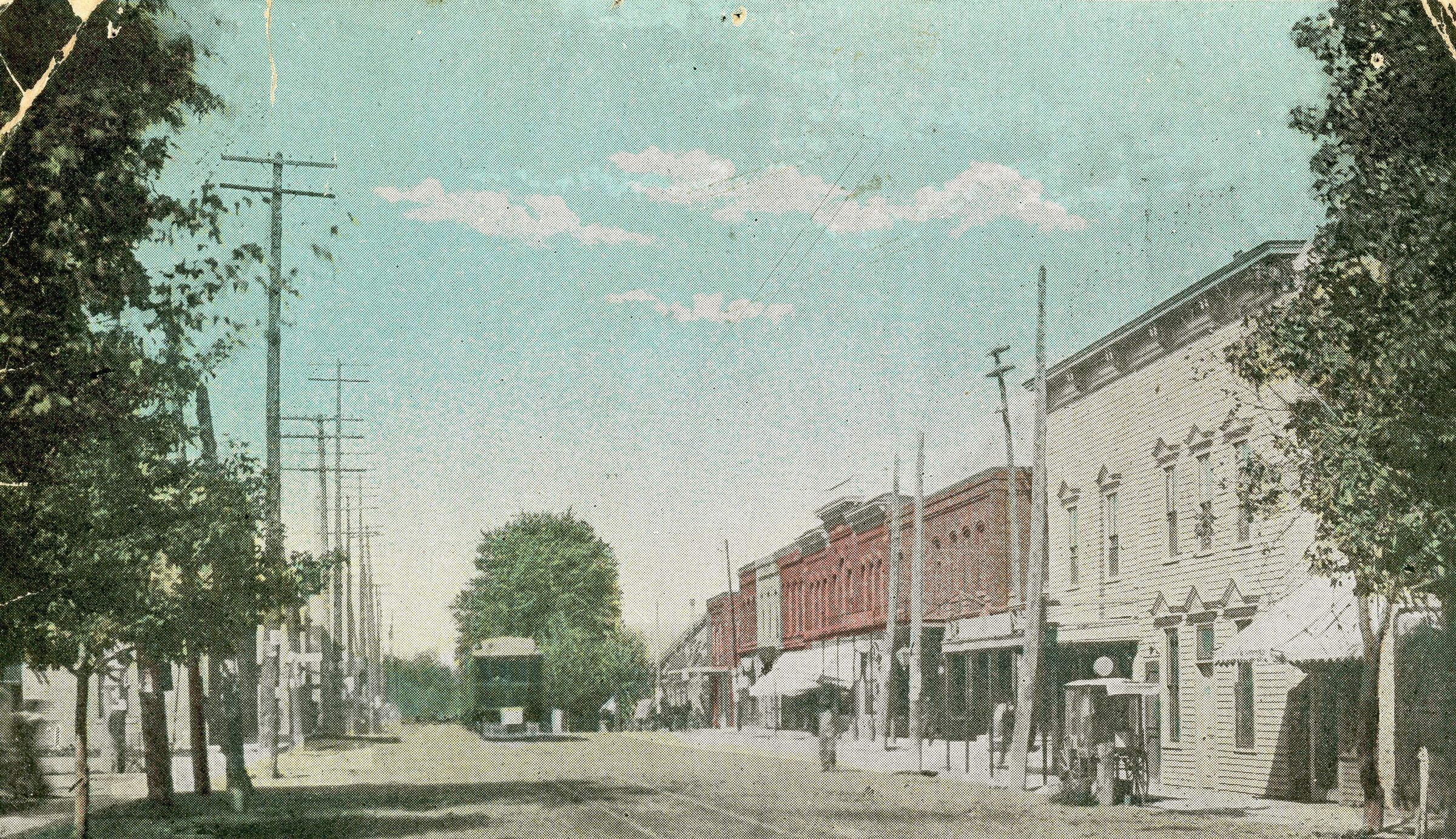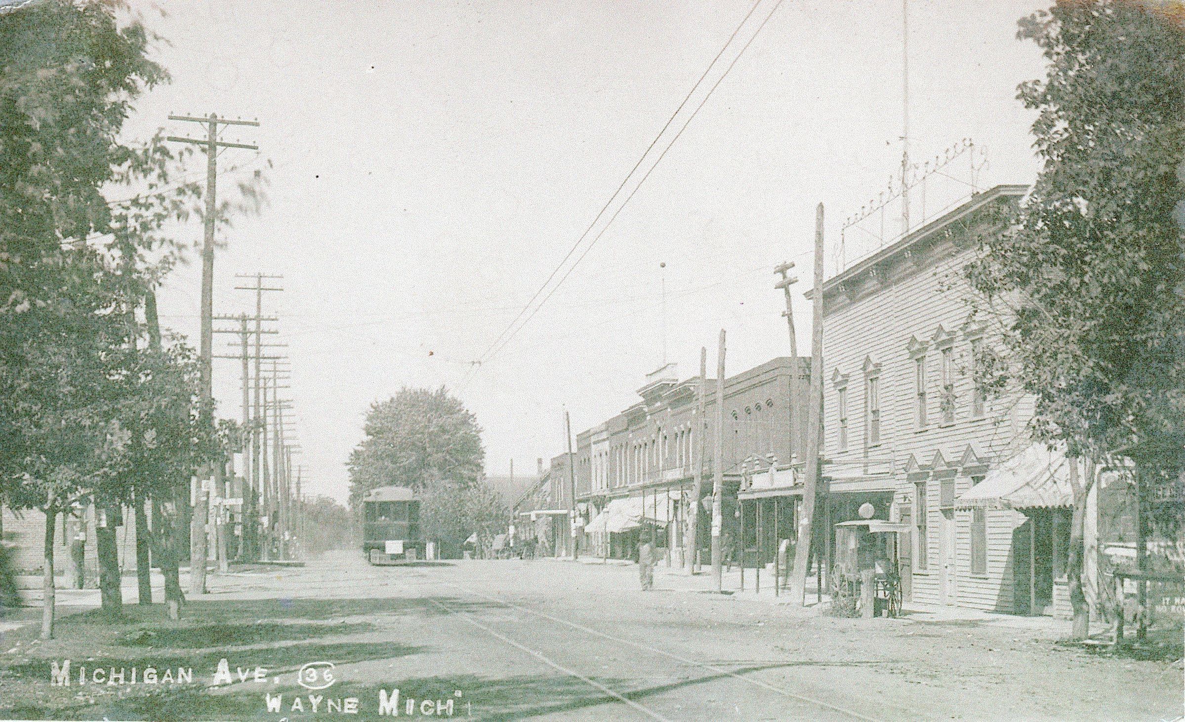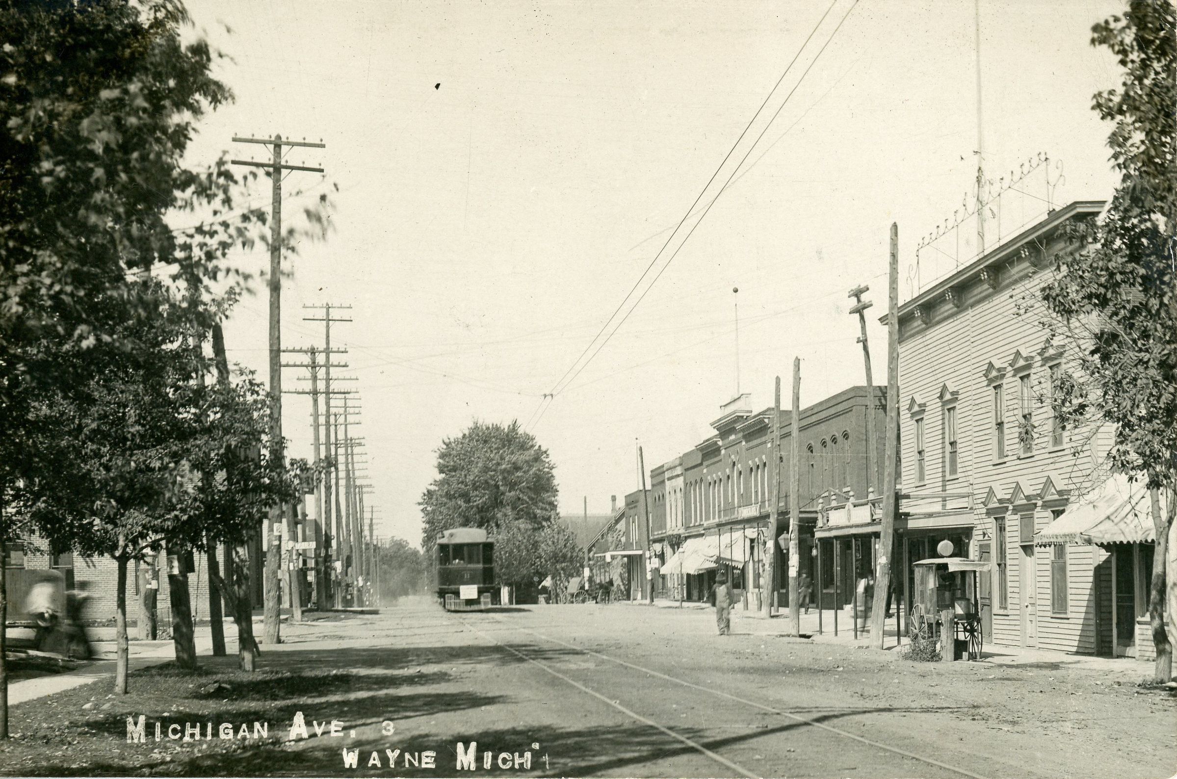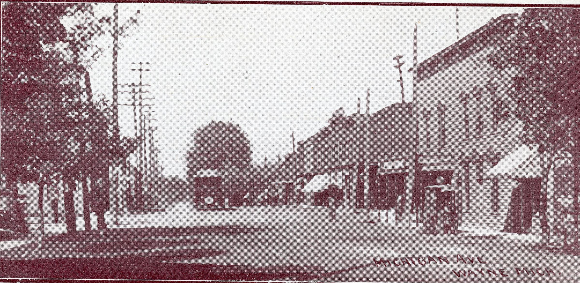 Michigan Avenue looking West towards Wayne road. 1907. Varney Zephuss Hotel at right, Wayne road and Bank Block. Streetcar on tracksCataloged By