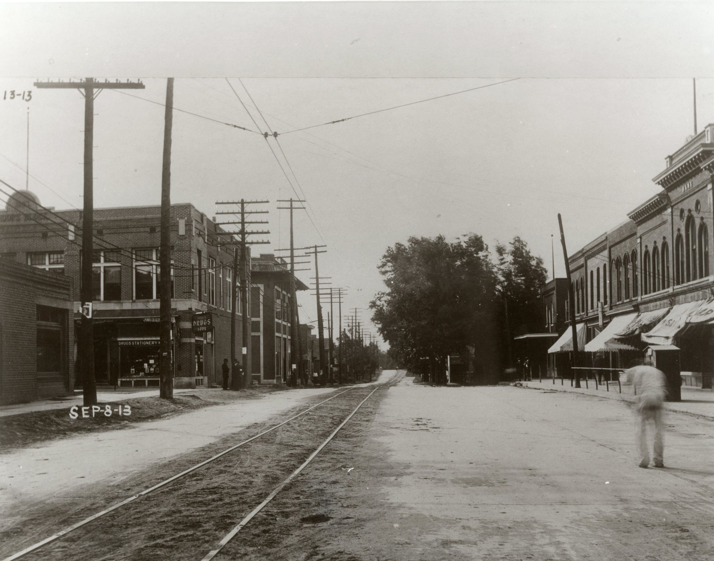 Michigan Avenue looking West from Wayne road. September 8, 1913. Monroe Street and Hoops Block on left, Bank Blockon right side. DUR streetcar tracks visible.Cataloged By