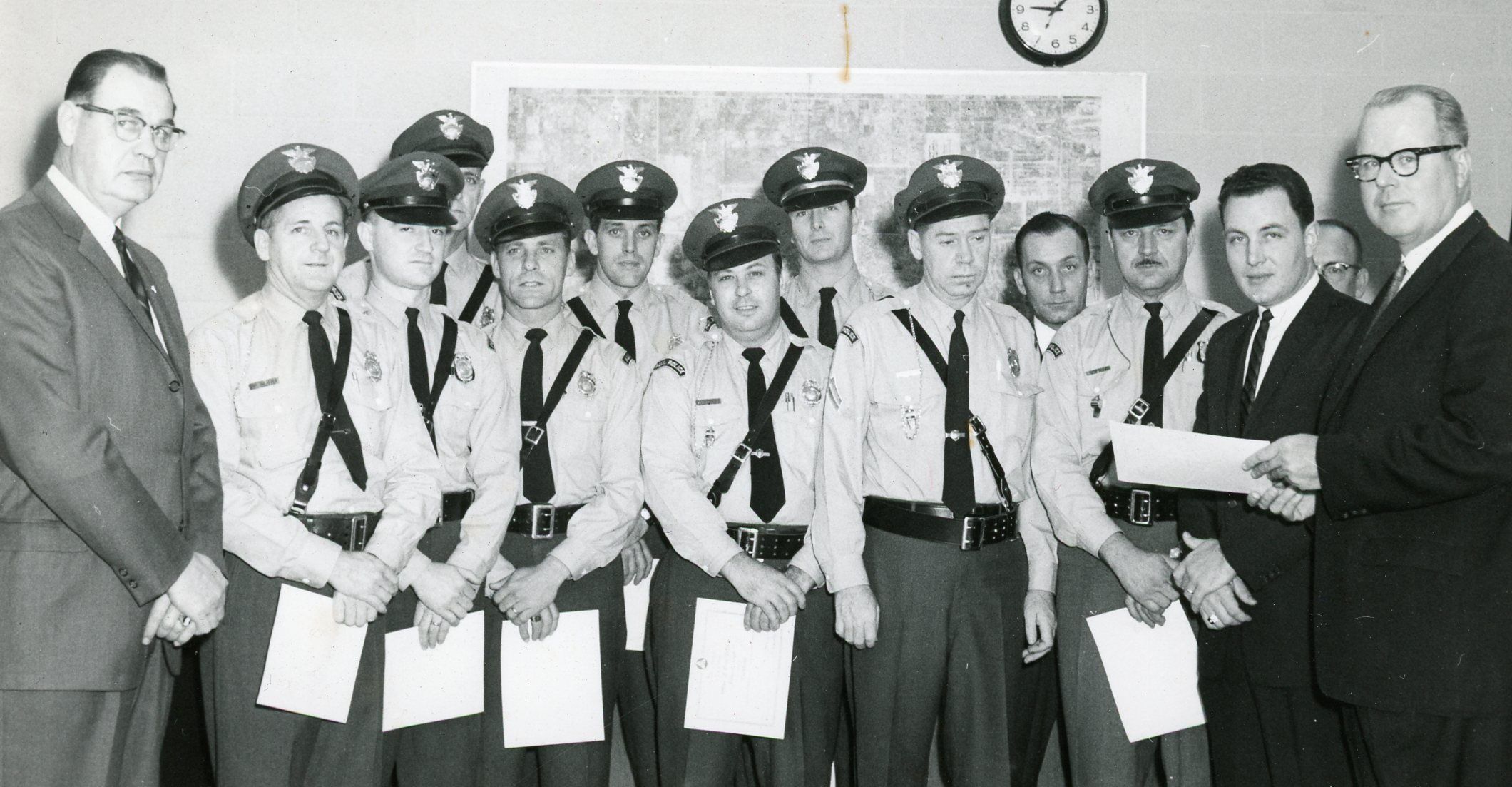 Wayne Auxiliary Police Officers. Left is Chief Yerster, Back Row: Don Edmonds in not hat, Front Suite Ray Lacarnu, Charles Curtis.Cataloged By