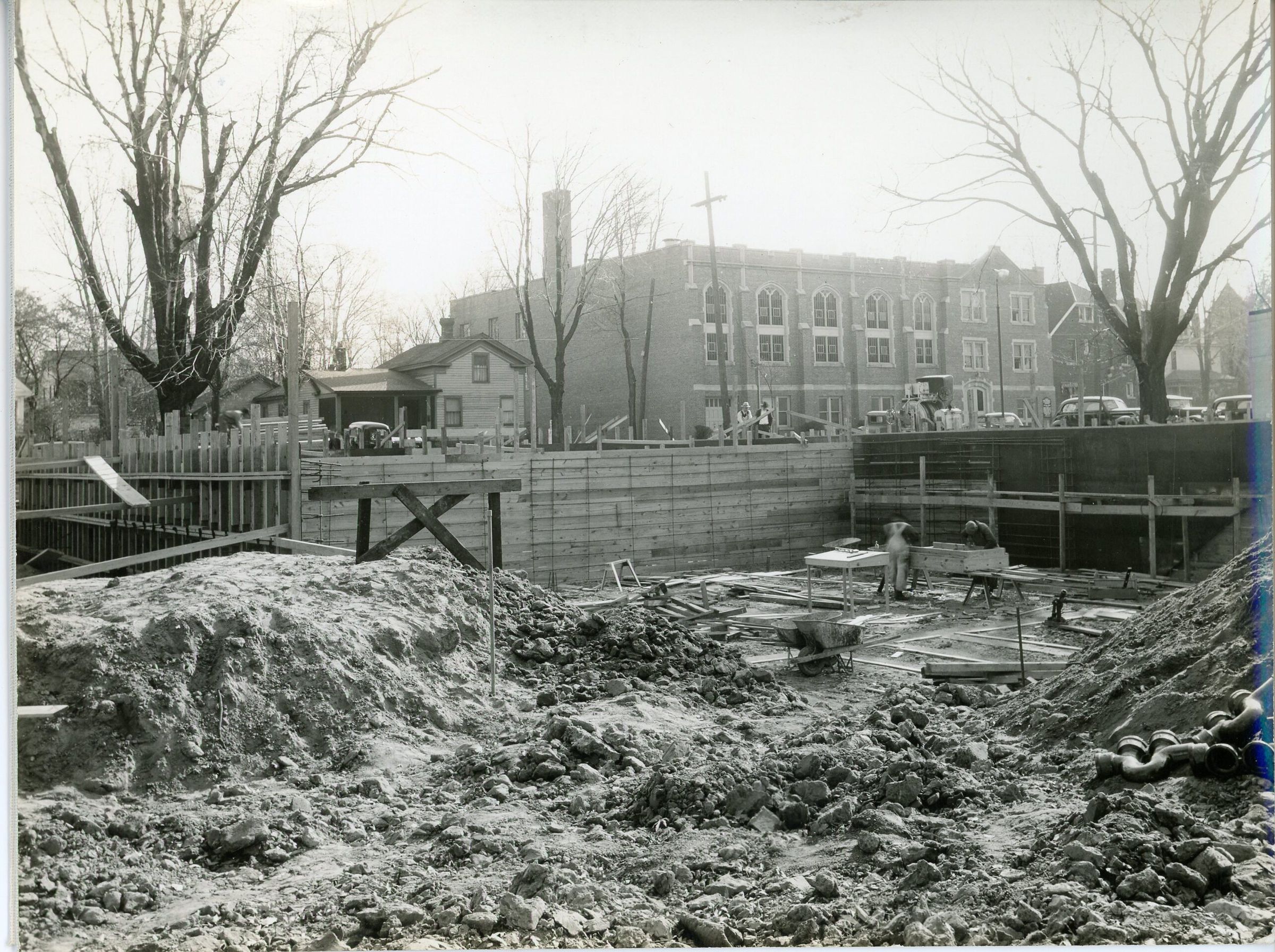 Wayne, Michigan Post Office being built. View looking SE. Taken by Spence Brothers Contractor on Nov. 26, 1937. Methodist church house and parsonage seen in background.Cataloged By