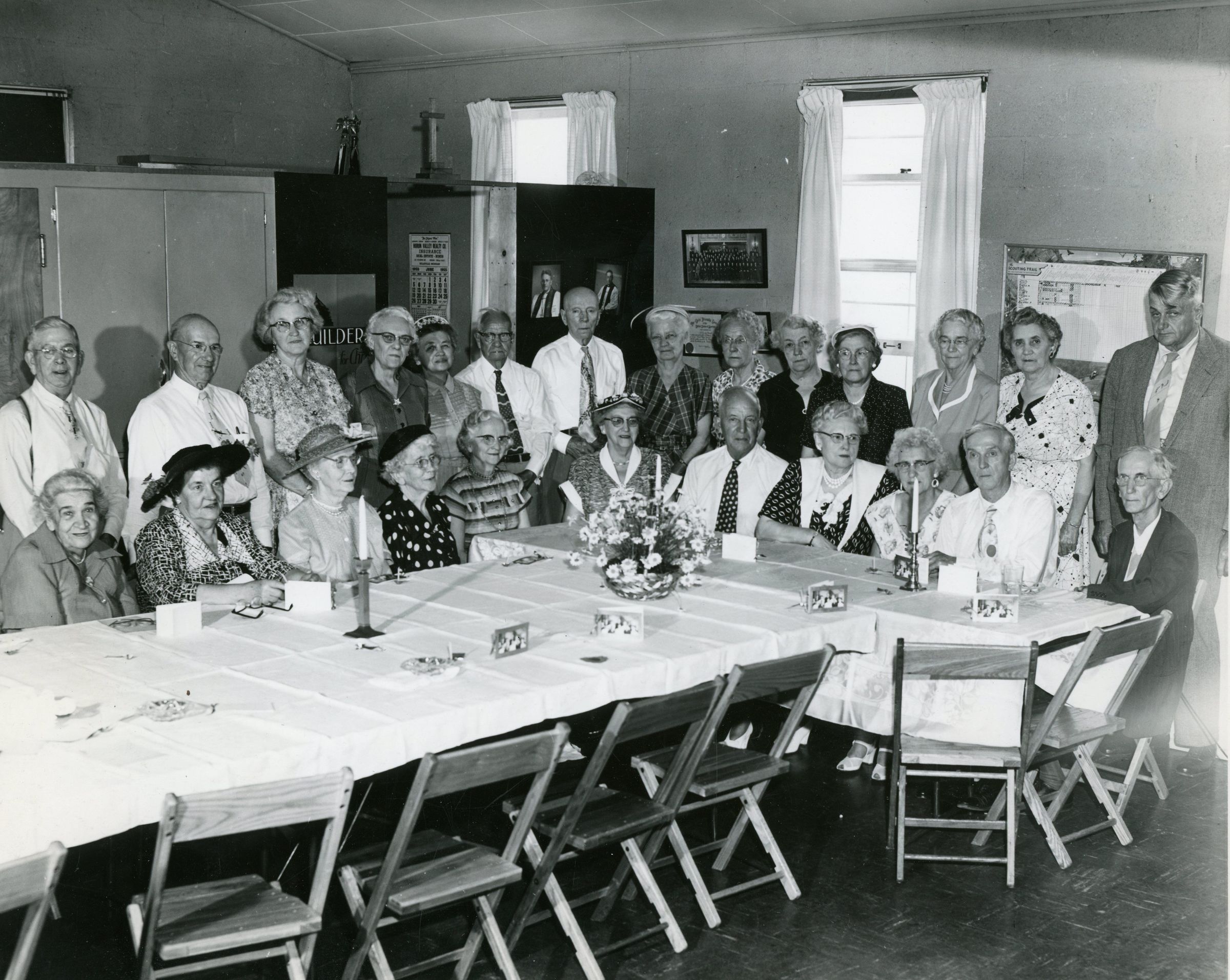 Class of 1904 Reunion in June of 1956. Jim Carmichael, Blanche Carmichael-Burnham, Janet Curtis-MacFarlane, Amy Shannon- Stevenson, Jessie Chaffee-McMurtry, Ina Hayes-Jewell, Mabel Fischer-Mcgarvey, Joe McGarvey, Glenn Smith, Irene Smith, Nell Robinson, Fanny Shook, Aleck Shook, Homer Jewell, Seated Elizabeth Stellwagen (a teacher), Estelle Bostwich-Jamieson, Agnes Spoken-Harris, Mary Brewer, Elizabeth Orr-Wetherell-Frank, Grace Smith-Peters, Clyde Frank, Helen Killen-Snyder (Pete) Florence Beeman-Forsythe, Clarence McCarty and Tracy Murtry.Cataloged By