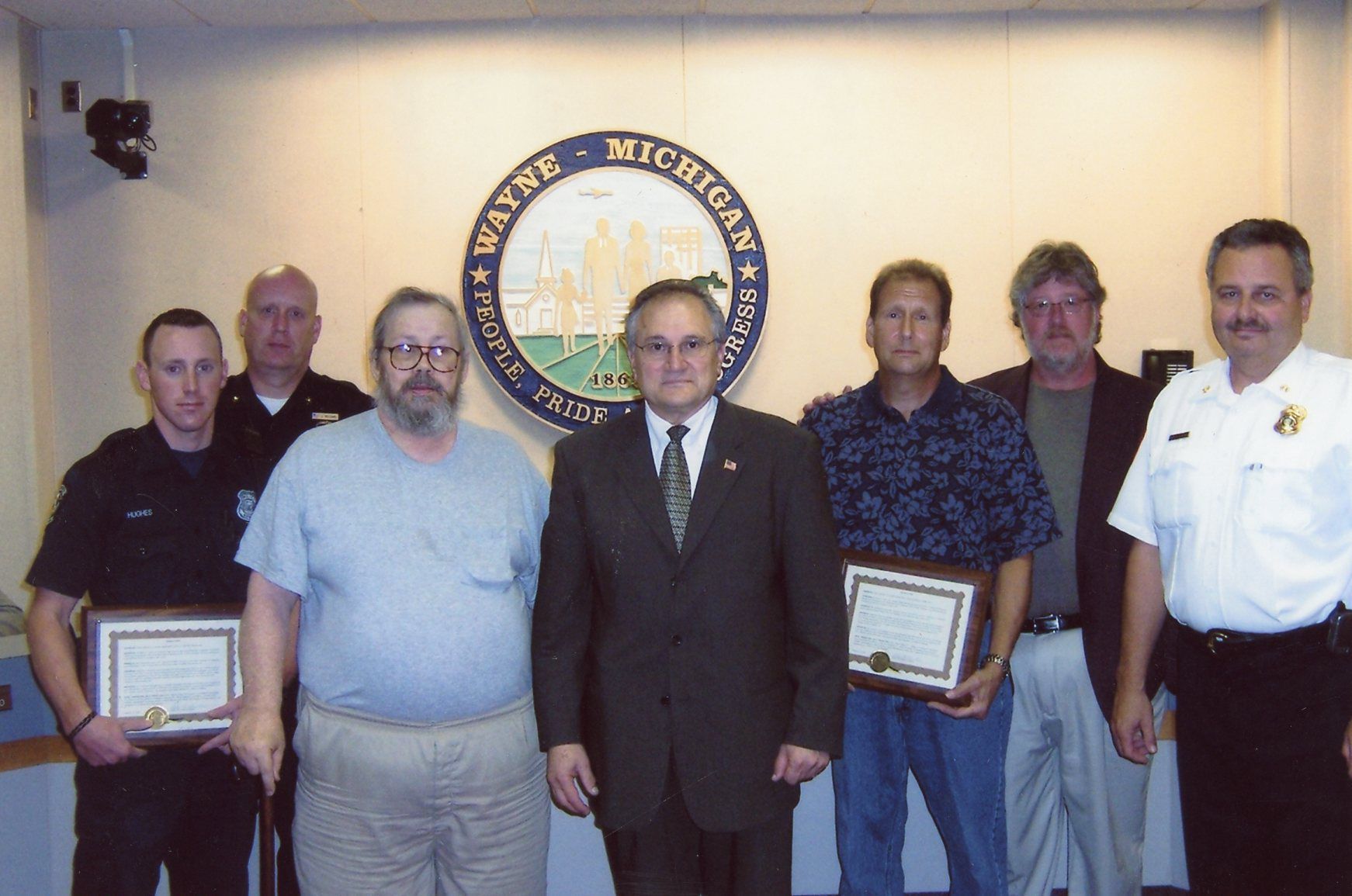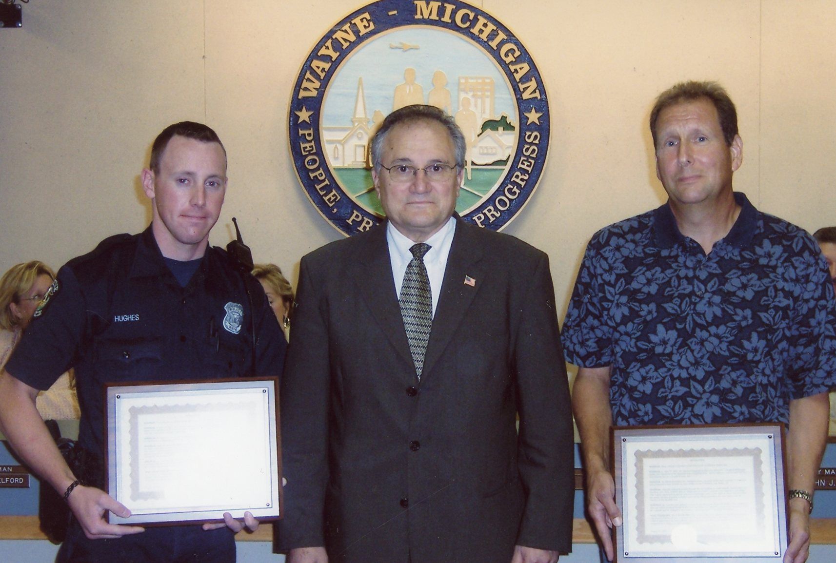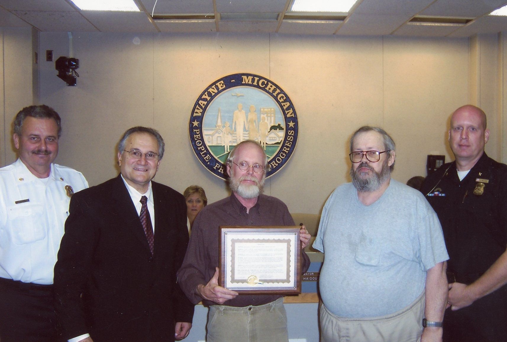 The story goes that the postal carrier (Dave Leahman) noticed that Jim Garrison's mail was beginning to stack up, and he mentioned this to the neighbor Larry Edmonds. Mr. Edmonds called the police about not seeing Mr. Garrison and his mail piling up. Officer Abe Hughes was dispatched to the Garrison residence and looked in the window and found Mr. Garrison on the floor. All were recognized for their part in possibly saving the life of Mr. Garrison.