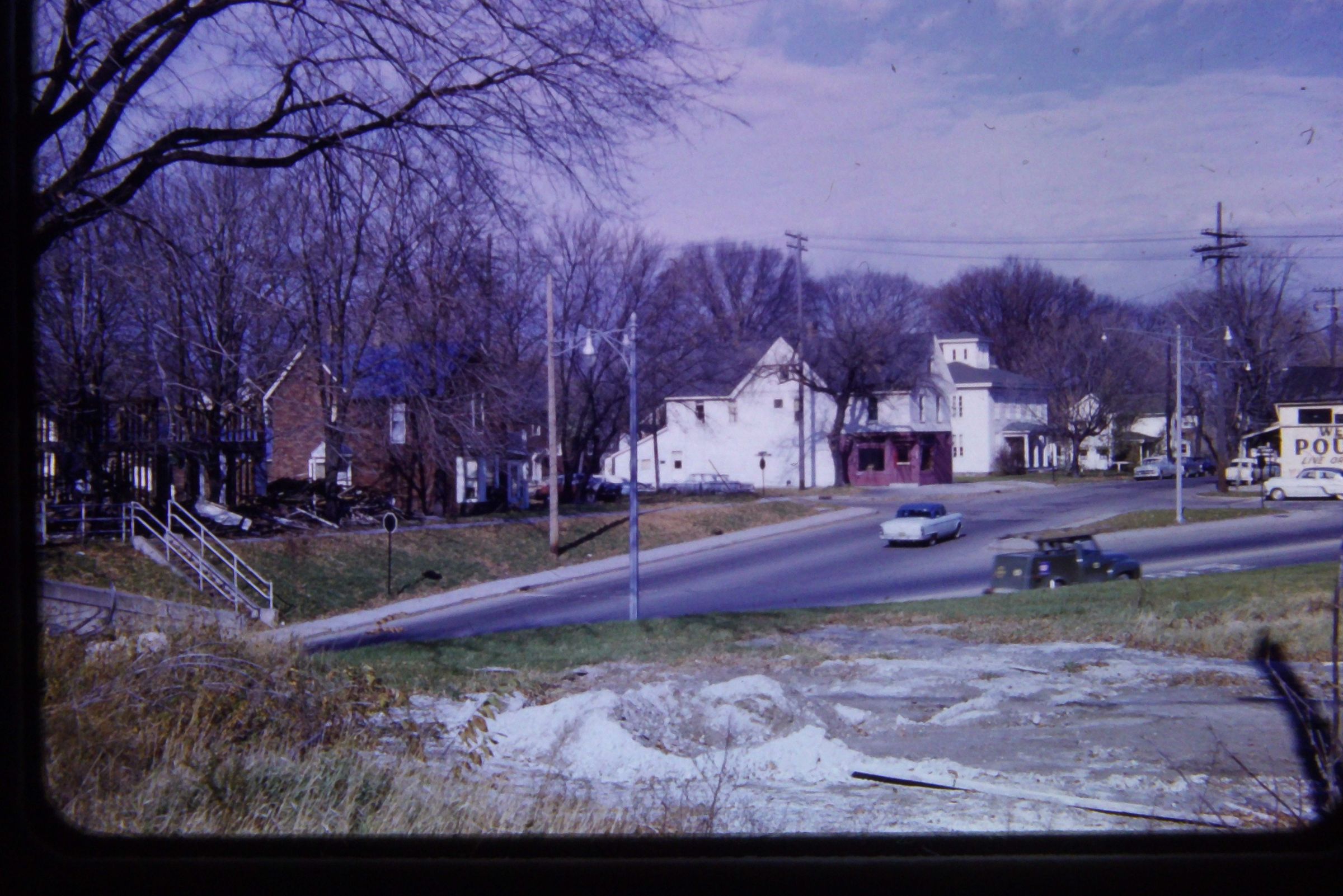 4018-3930 Newberry, looking NW from RR viaduct. Ruins of fire at left, NW corner brush and Newberry is Francisco Meat Market, Steers house. Pre-Urban Renewal