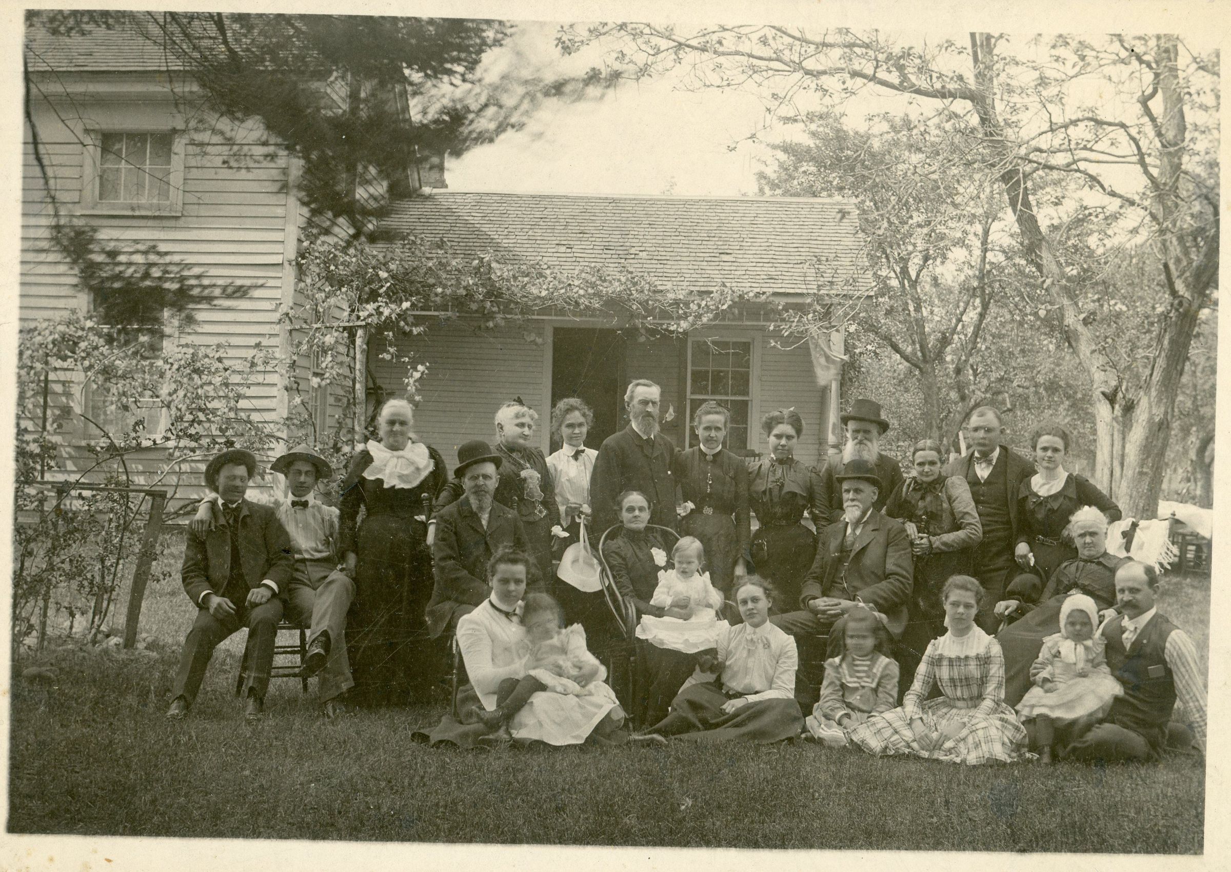 Thomas Ackley Reunion. Harriet Smalley Smith " Mrs. Harley" appears to be seated infront , next right from women holding baby. probably about 1900.