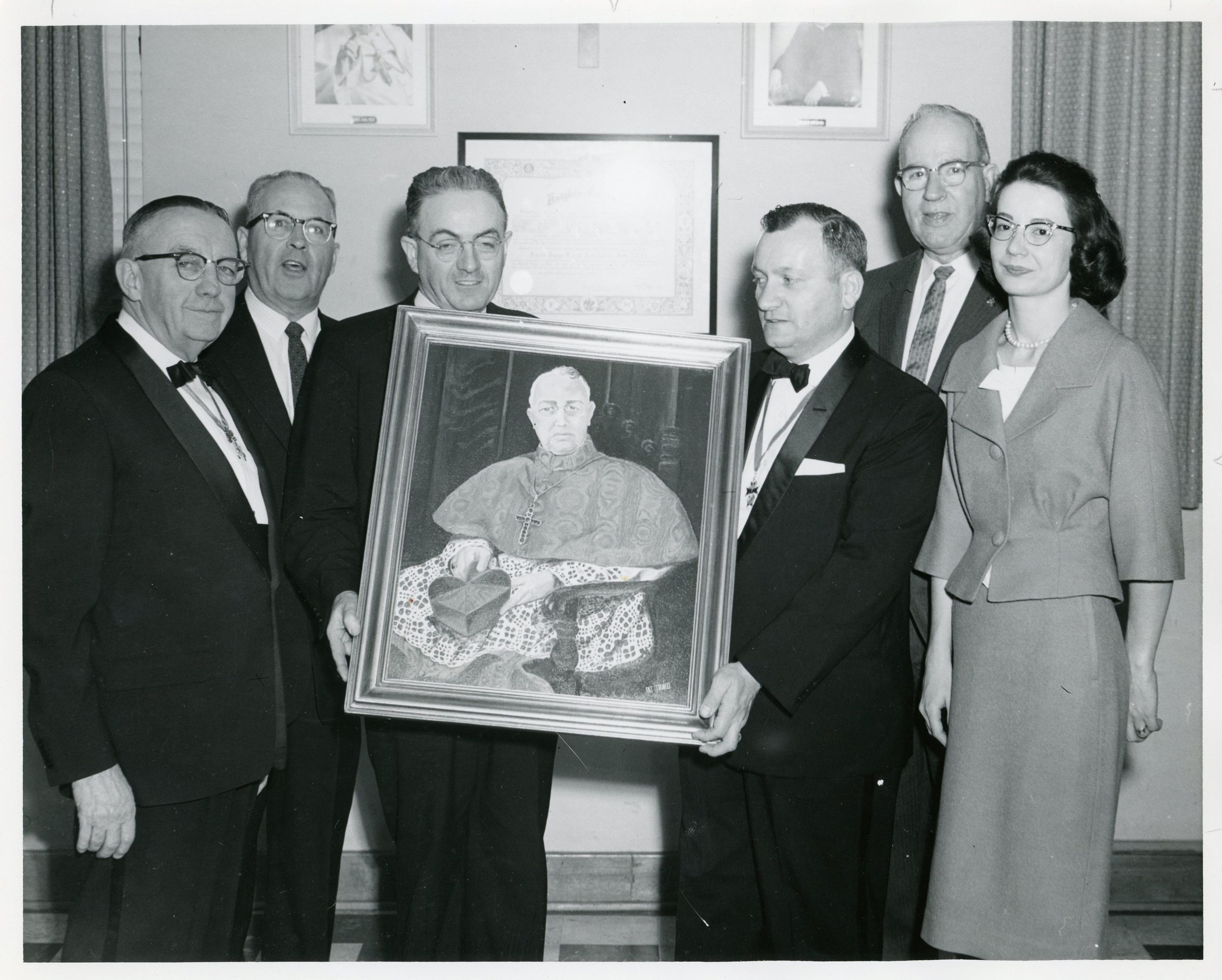 Painting of Cardinal Edward Mooney, archbishop of Detroit. (L-R) Edward Sullivan, J. Lawler, Brother John, Frank Opaleski, Vincent O'Meara, Patricia Trudell - The Painter. 5-10-1961Cataloged By