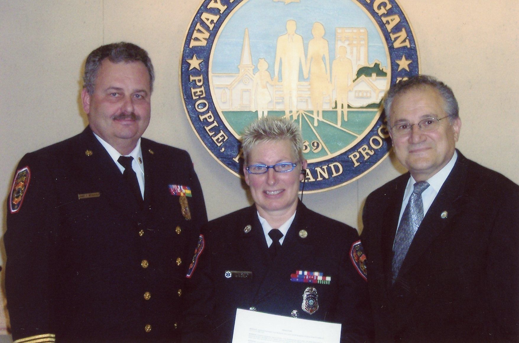 From left to right; Chief Reylords, Firefighter Cindy Boring and Mayor Al Haidous. The Wayne Mayor gave recognition to Cindy Boring.Cataloged By