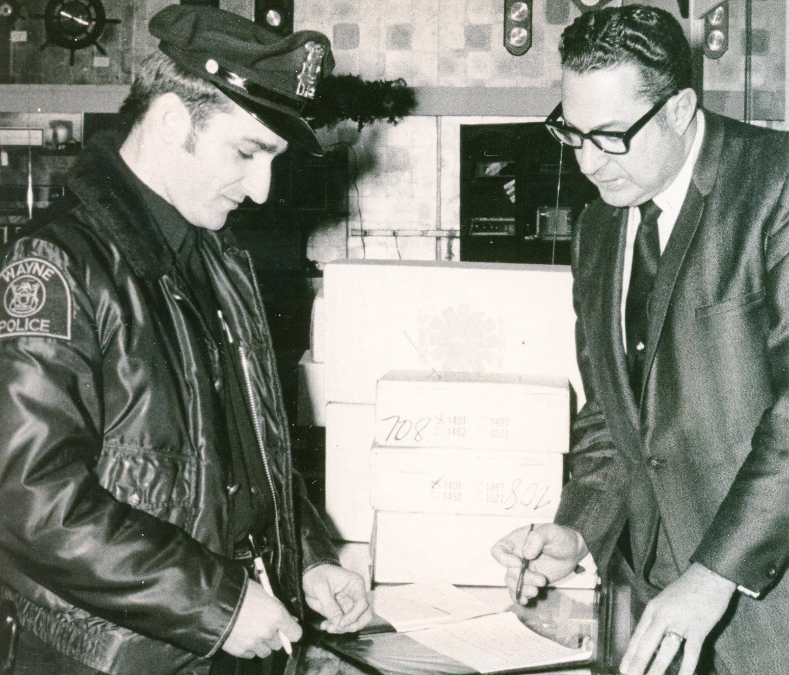 Wayne Police Officer Ron Ken and store manager Marvin Shlain filling out paper work. Photo taken in Dec. 16, 1970 by Lothor E. Konietzko for the "Eagle".