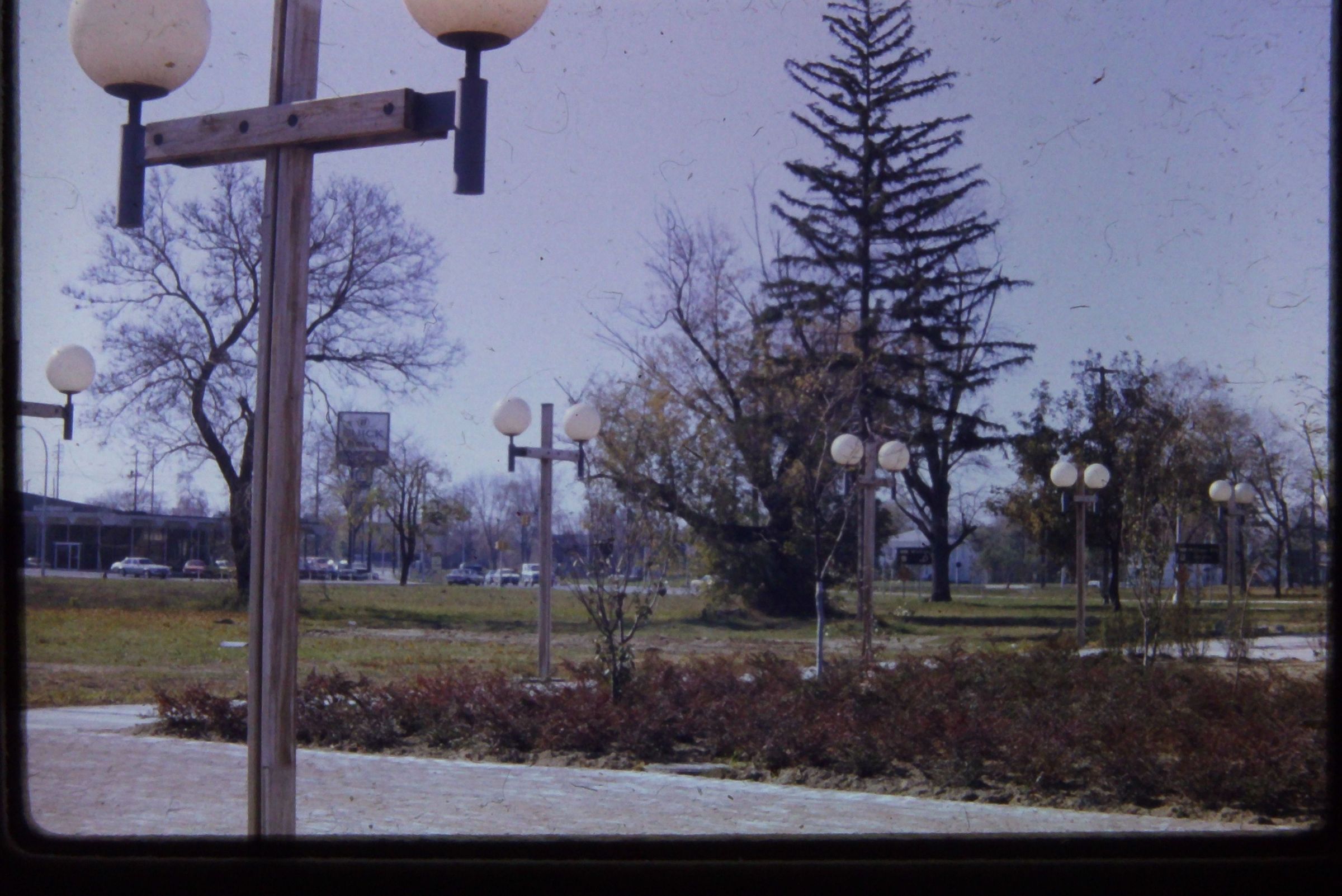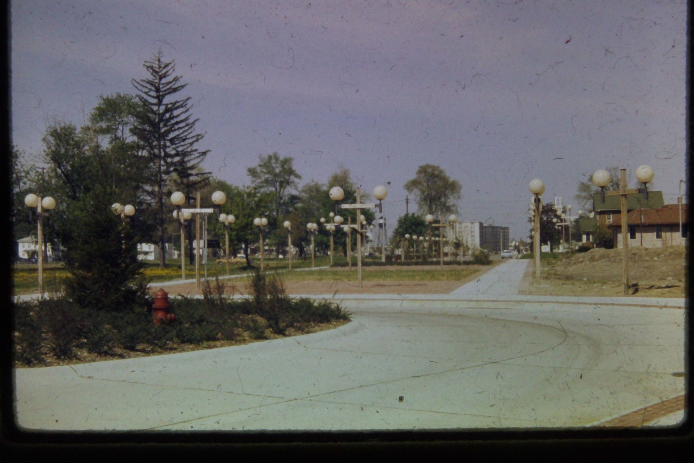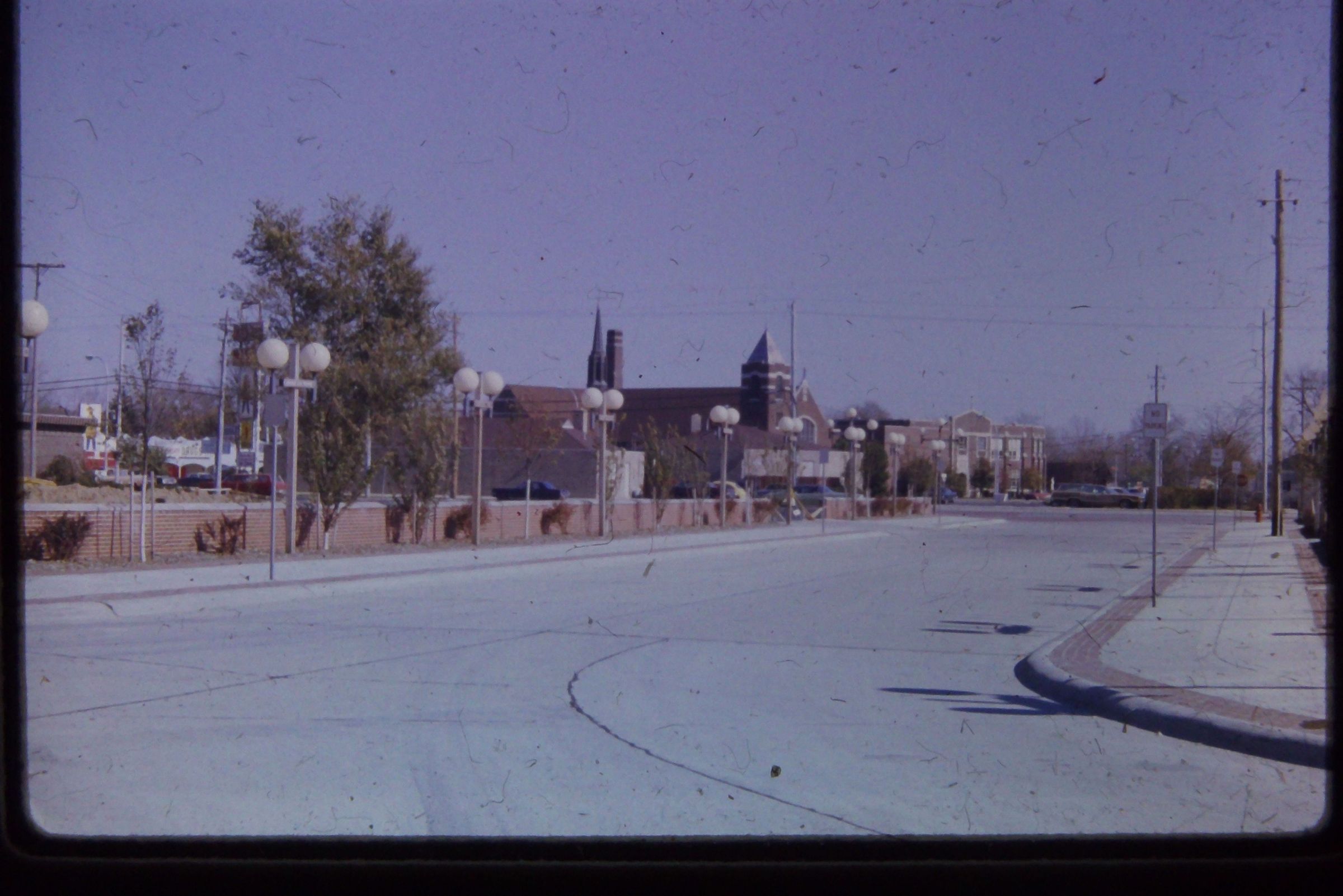 Veterans Plaza Roundabout, formerly Main Street. 1974. Post urban renewal. Before Peace Memorial was built.Cataloged By