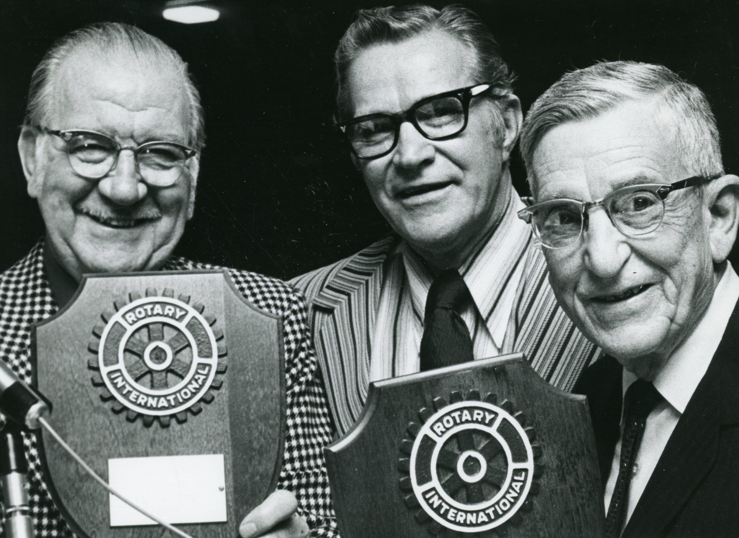 Jim Glennie and Bill Detweiler won Rotary International Awards. Bern Steele is in middle. "Two Winners" is title of the photo taken by Lothar E. Konietzko for the "Eagle" on Nov 8, 1972.Cataloged By