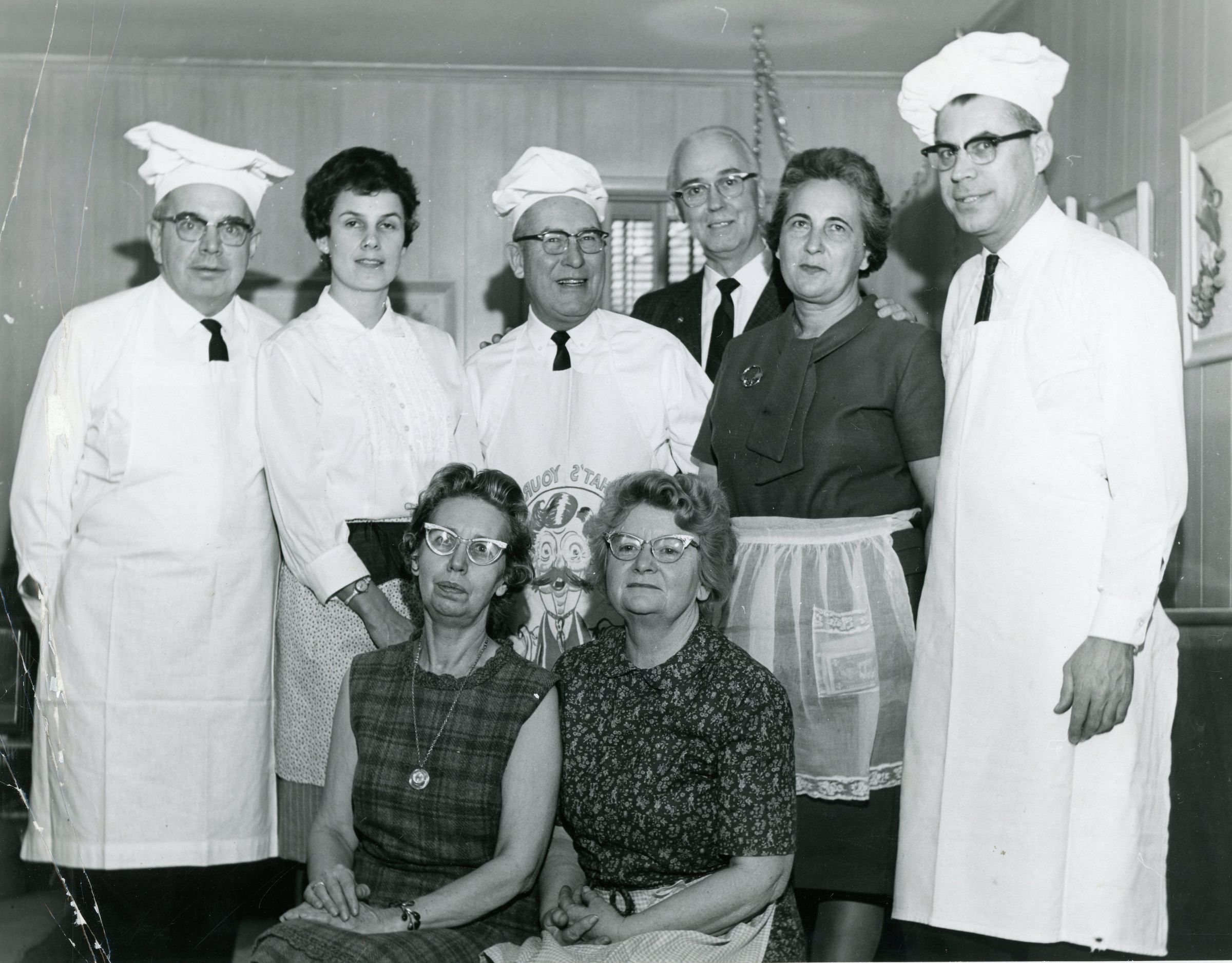 Rotary Club Members at Rotary Ann's Annual Breakfast Meeting at Dr. and Mrs Clarence Hinchey's Residence. From Left to Right; Mr. Ralph Biebesheimer, Mrs. Myron Becker, Niram Hawley, Dr. Clarence Hinchey, Mrs. N. Hawley and Myron Becker. Mrs. Hinchey and Mrs. Beibesheimer are sitting.Cataloged By