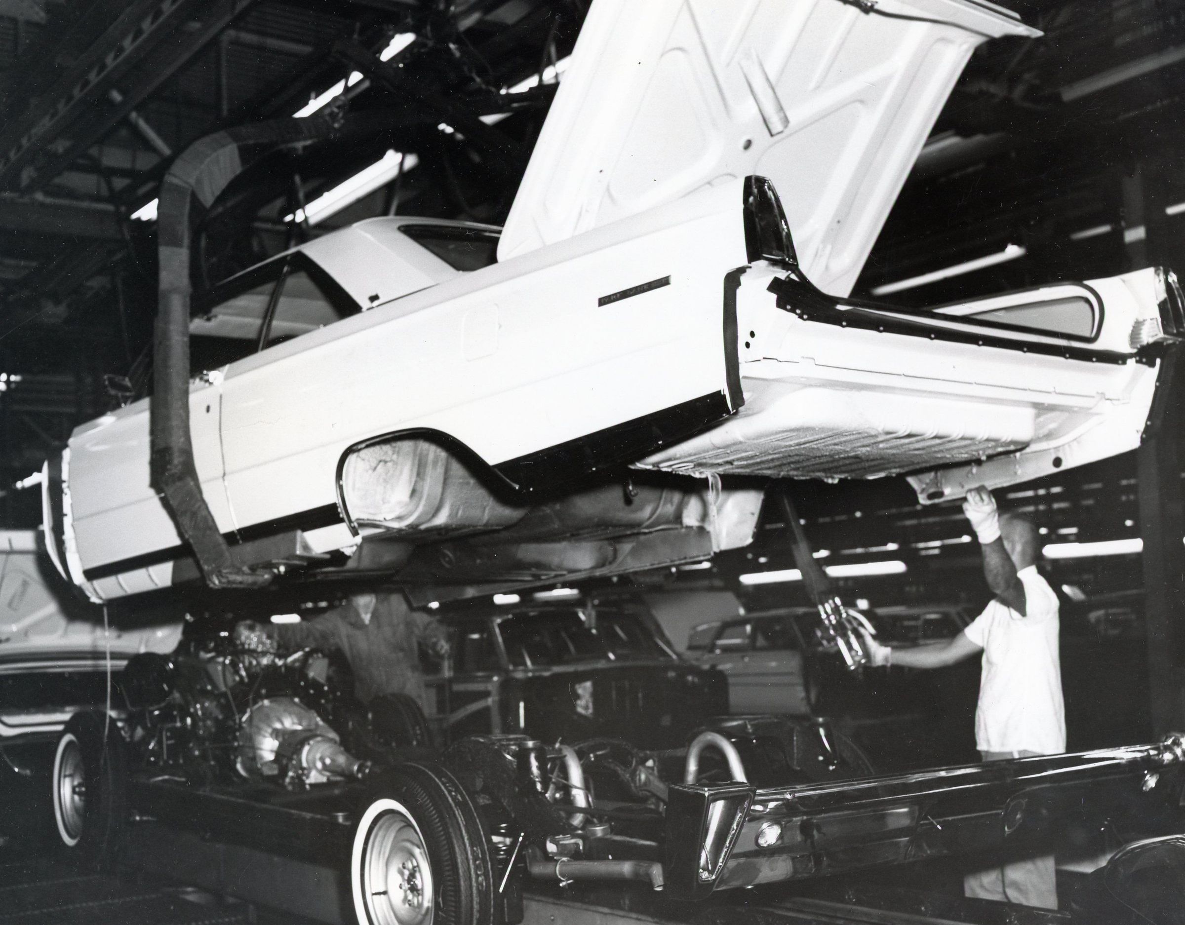 Chassis being lowered onto frame in Wayne Assembly Plant.