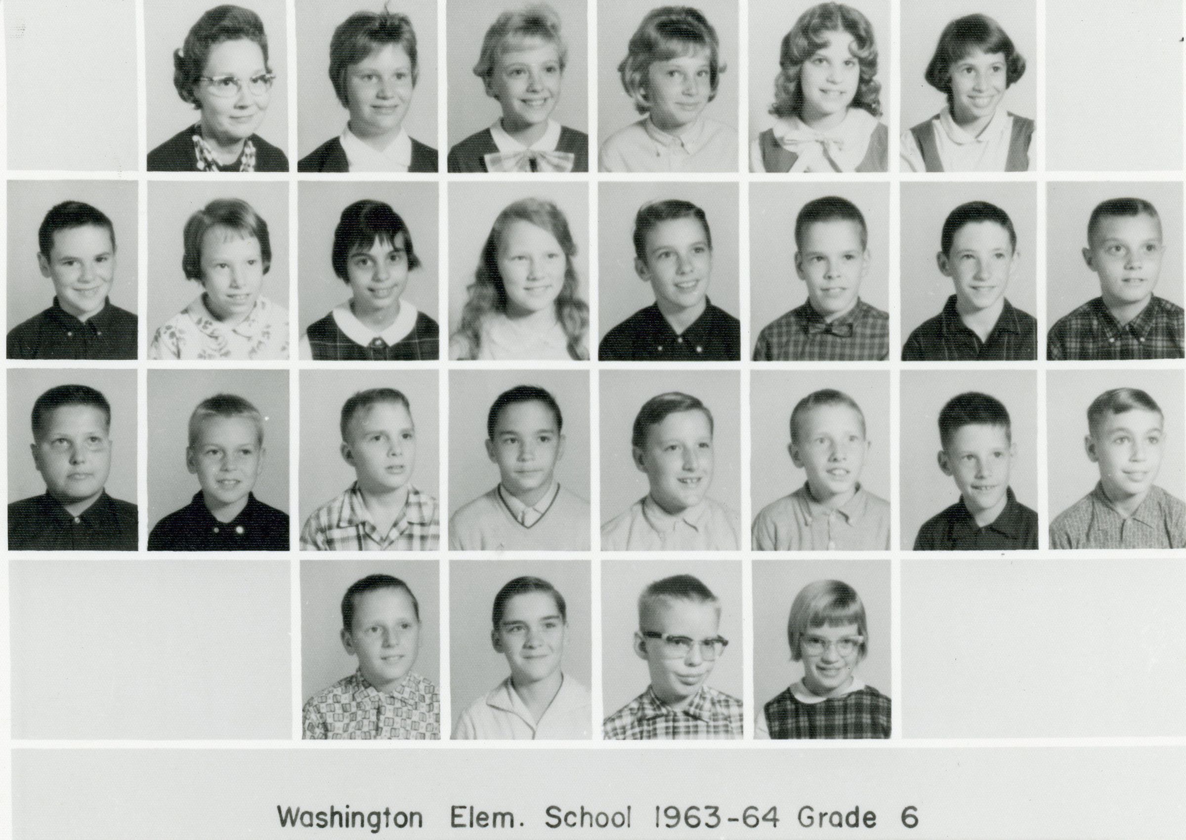 Washington School 6th grade class 1963-64. (L-R) Myrna Smeltzer (Teacher), Karen Prieskorn, Linda Montante, Cynthia Osmun, Denise Nickolas, Justine Farmer, Carol Hopper, Diann Fruit, Sharon Hermatz, Marilyn Coleman, Mark McAllister, Fred Coffin, Eddie Smith, Tim Check, Mike Mattson, Ralph Starr, Stan Edmunds, John Newlin, Craig Malkowski, Richard Pierce, Ed Green, Steve Yandian, Jerry Firby, Frank Lohr, Ben Cline, Margaret "Peggy" HalseyCataloged By