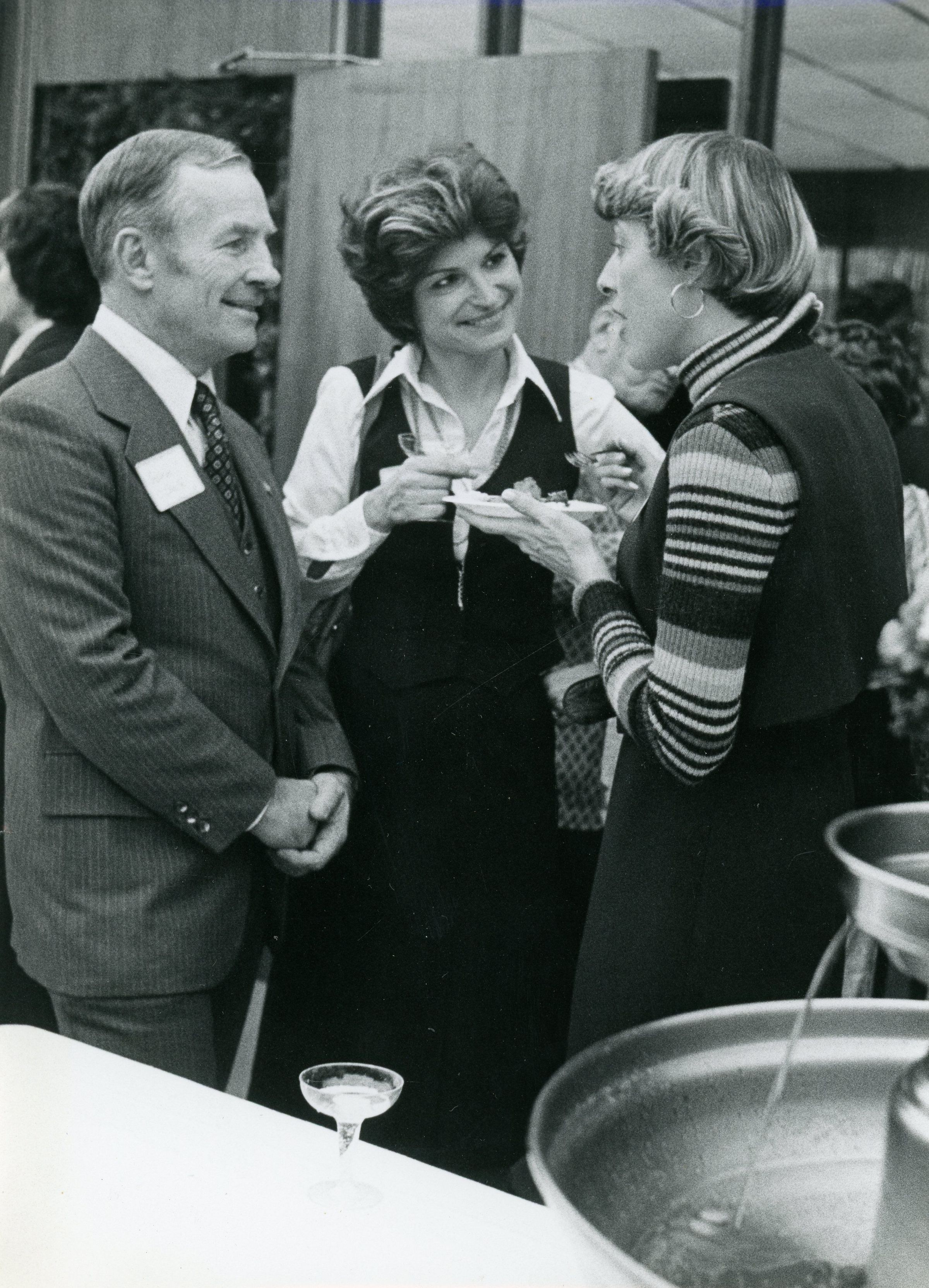 Rotary Club Members Mr. & Mrs Geo. Smith and Mrs. Necker talking. Photo taken by Lothar E. Konietzko for the "Eagle" on Dec. 10, 1976.