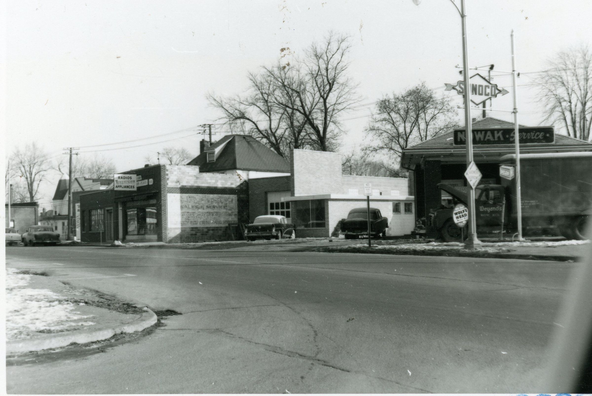 East side of Monroe between Main and Brush. Looking NE from Brush. 3947 Monroe Nowak Gas Station. Appliance Store. Torn down for Urban Renewal.Cataloged By