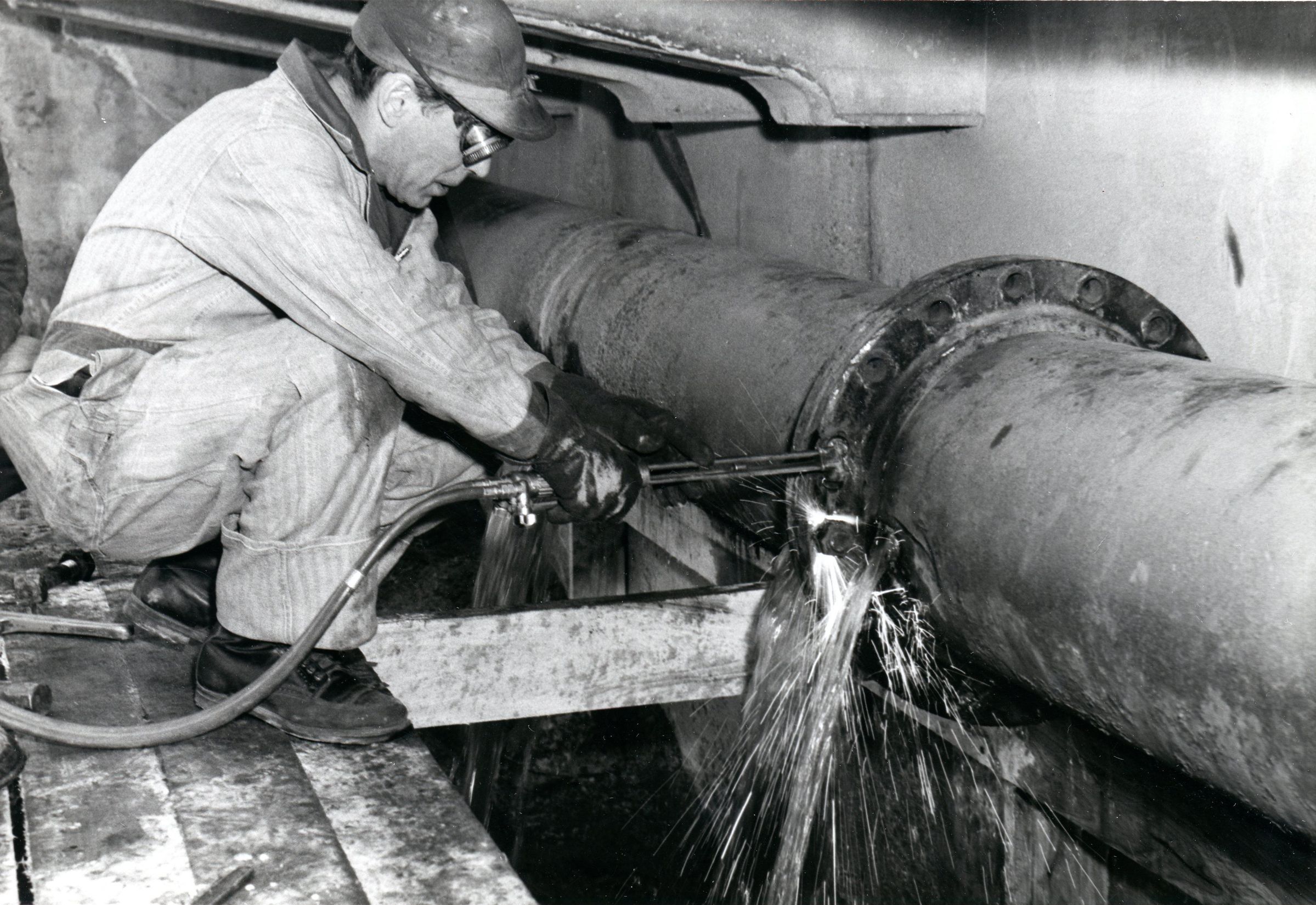 Al Cooper welding sewer pipe under Wayne road bridge 1956
