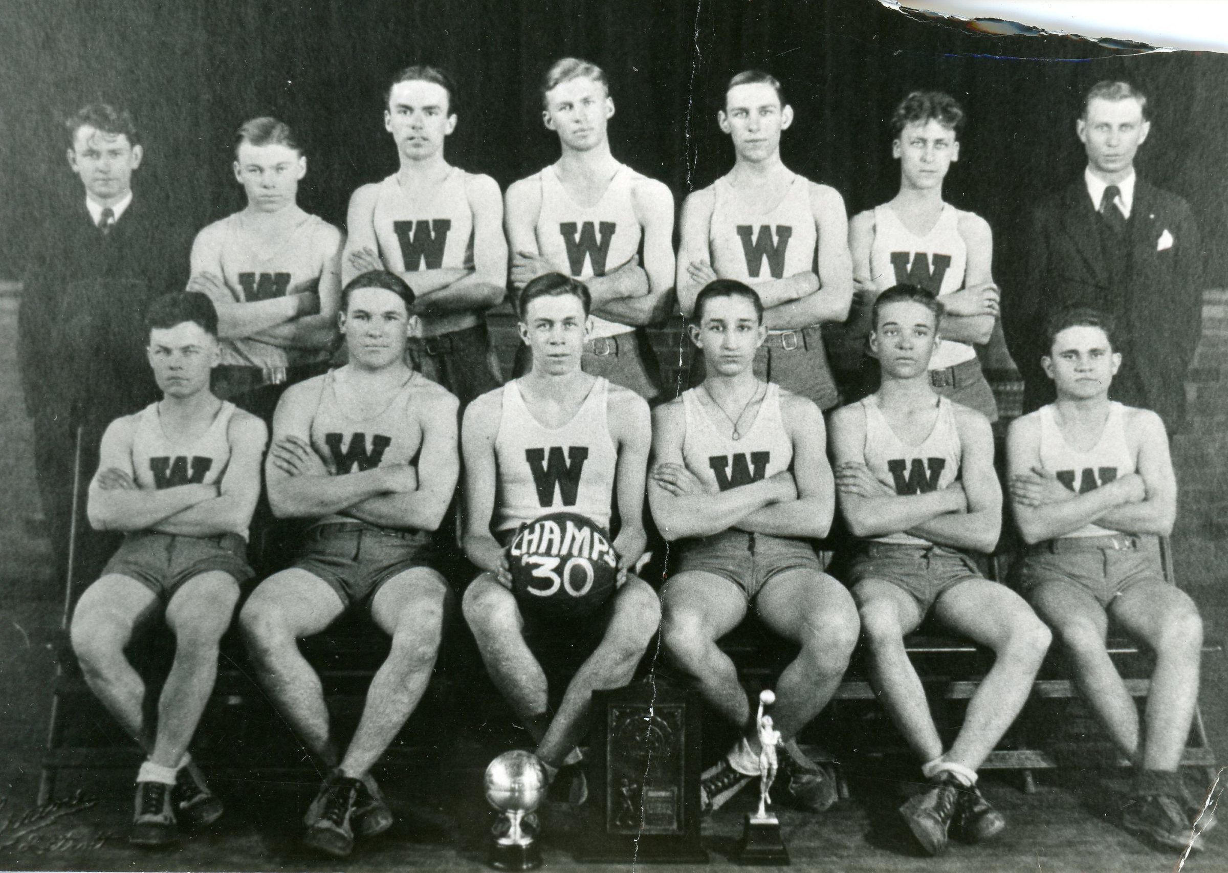 1930 Basketball Champs. Second from the right in the back row is Bill Ditmar and the very right in back row is Coach Alan MacLean. In Front Row, Fred Allen is 3rd from left.Cataloged By
