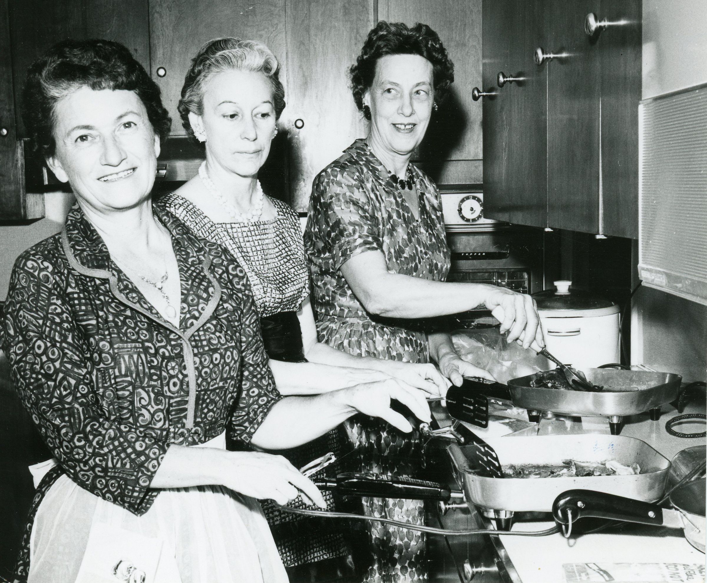 Mrs. Virgil Krueger, Mrs. Hutcherson and Mrs Andy Smith of Rotary Anns cooking breakfast in Mrs. Kuregers Kitchen.