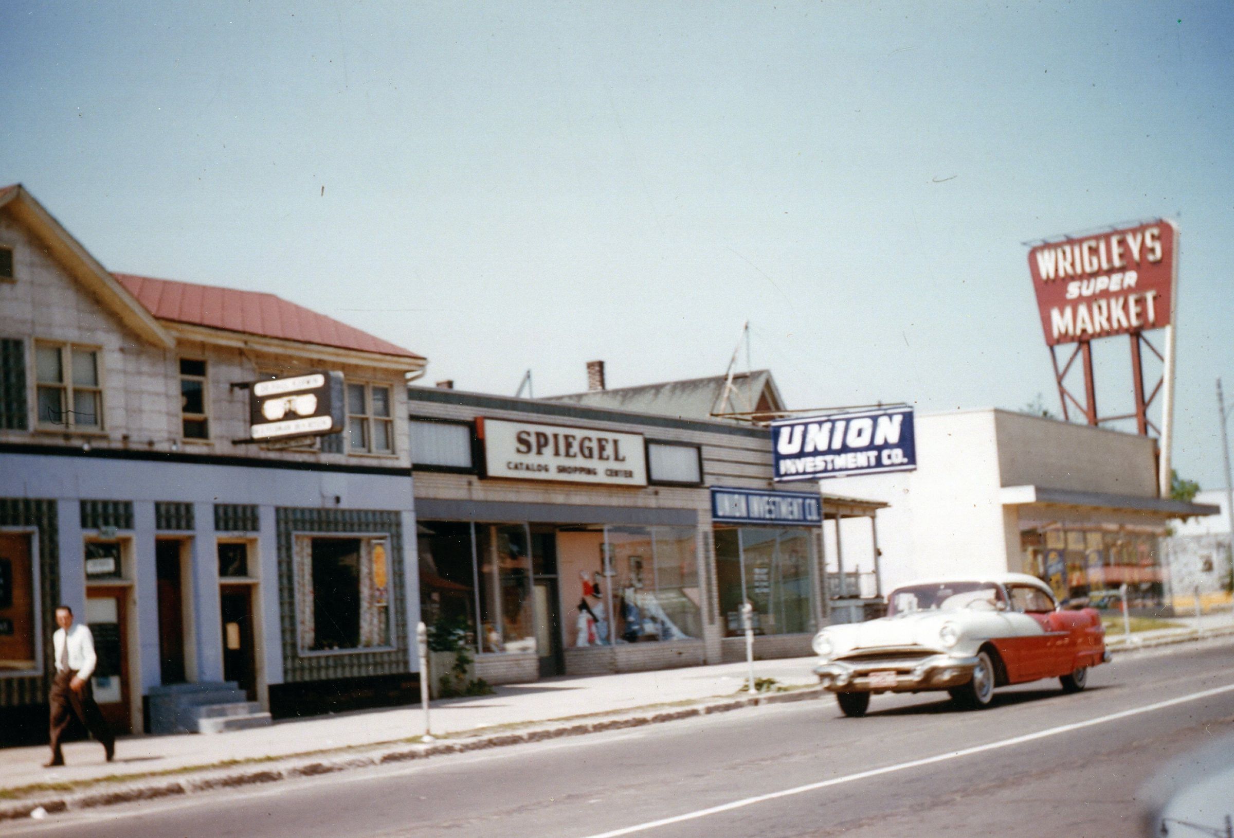 34833, 34841, 34843, 34853 Michigan. South side of Michigan between 2nd and Park. Wrigleys Supermarket visible. Torn down for Urban RenewalCataloged By