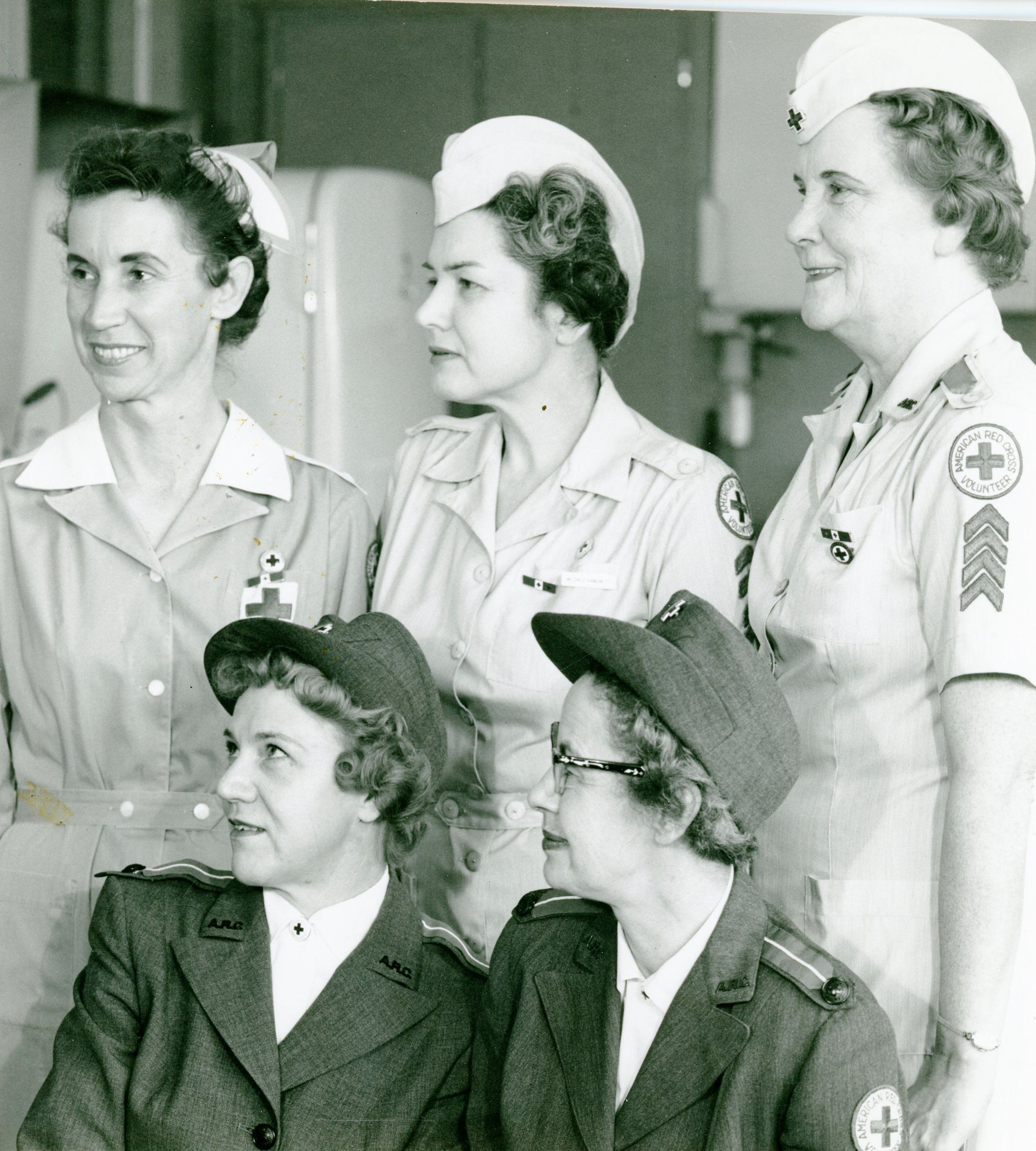Red Cross Dec. 1960. Mrs. Marvin Cutler (Dearborn), Mildred Hanchett, Mrs. M.J. Scarlett. Seated: Mrs. C.M. Irelan (Detroit), Mrs. Hugh Harvie (Dearborn)