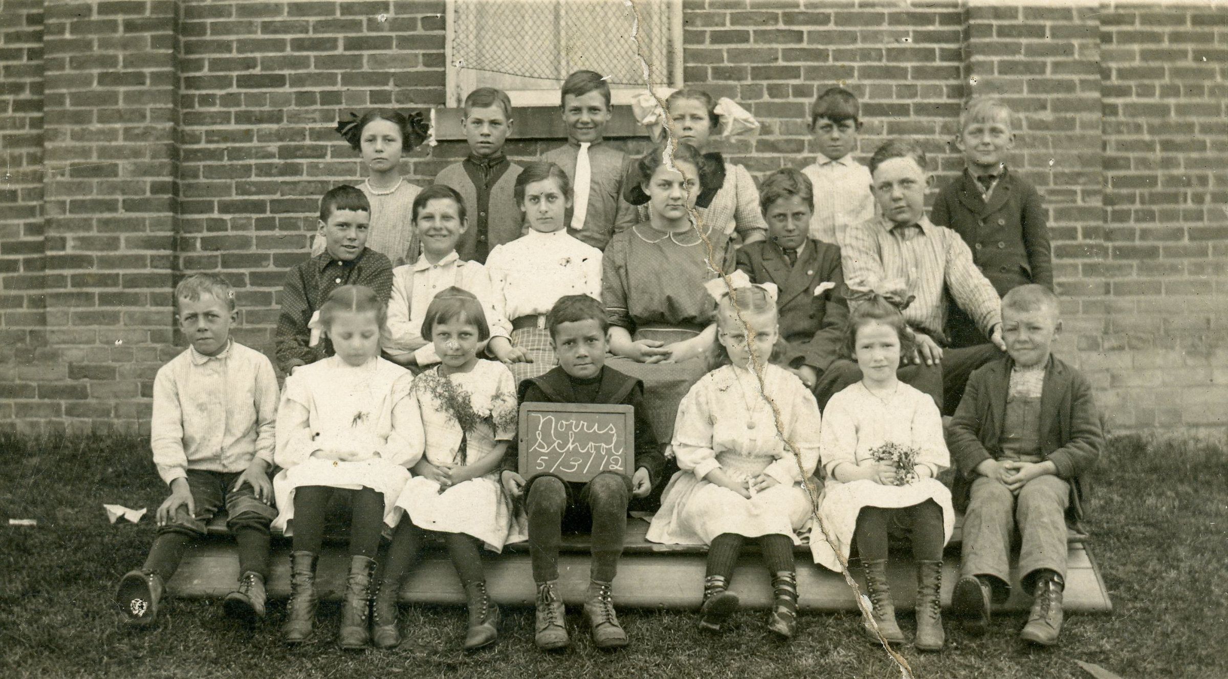 Norris School. c 5-3-1912. Ellen Martin Teacher. Middle row 4th in is Marian Raymo, 4th row far right is Norris Raymo, Bottom row left is Melvin Raymo.