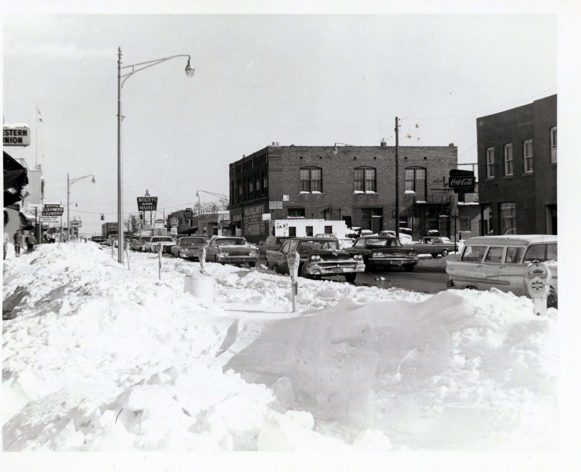 Michigan Avenue near Biddle, looking SE. February 1965. South side buildings. Rear of Hoops block in center. All torn down for Urban Renewal. Winter Scene, Snow.Cataloged By