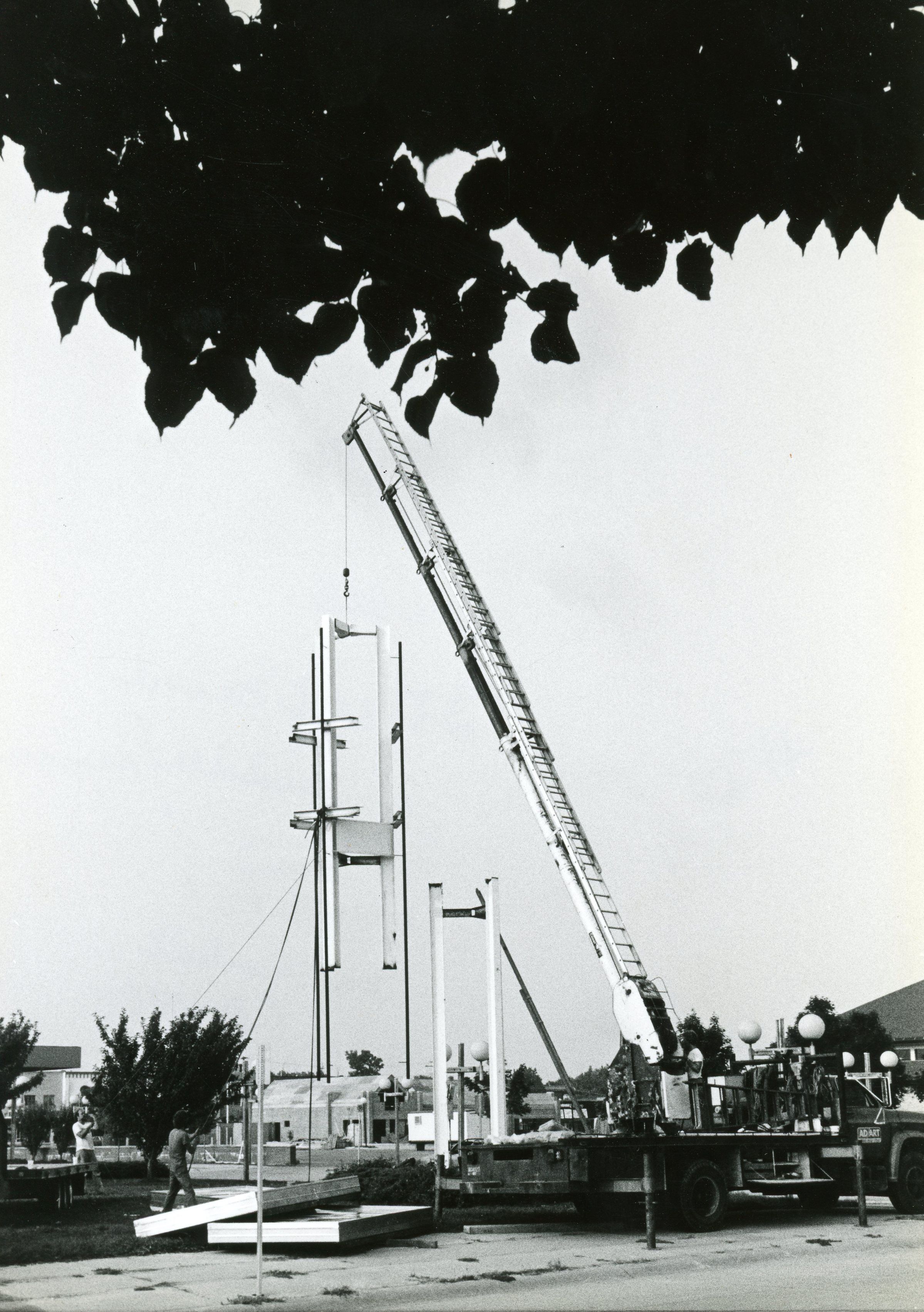 Removing Wayne Bank sign. Aug 17, 1983. Eagle photo. Corner of Methodist Church, when Wayne Bank became church