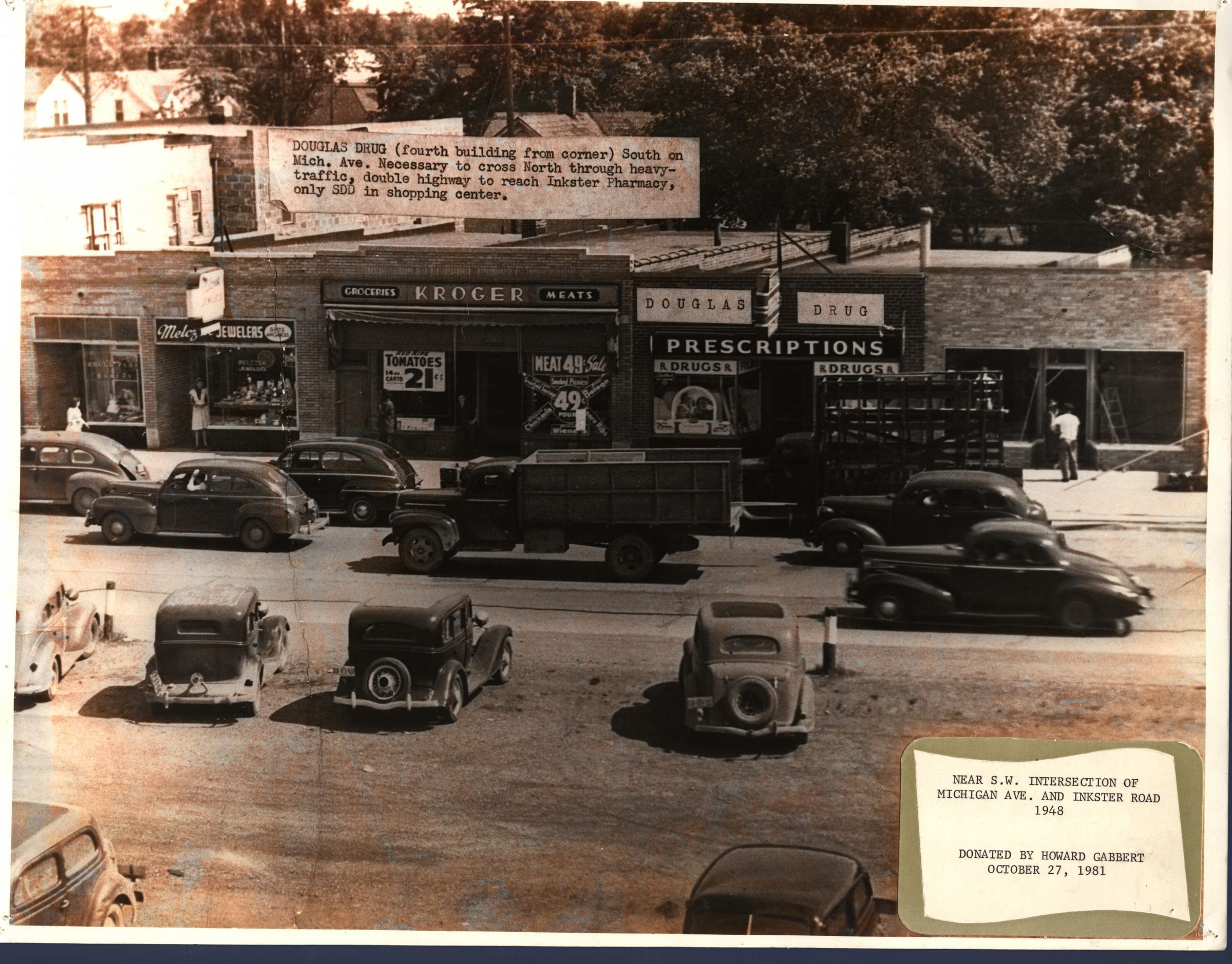 Michigan Avenue near SW corner of Inkster Road - 1948. Meles Jewlers, Kroger, Douglas Drug store. Inkster Plaza Strip Mall here nowCataloged By