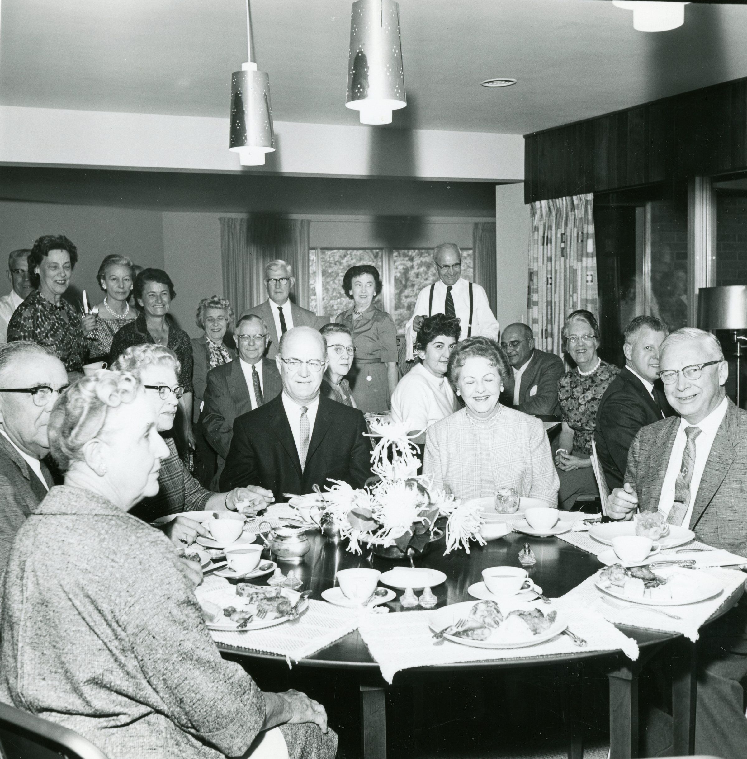 Rotary Members. In back: R. F Hutcherson, Marie Smith, Helen Hutcherson, Catherine Krueger, maybe Enid Chisholm, Mantans Uht and Dr. John Nutt, Mrs. Nutt, maybe a Mrs Andy Smith and a Mr. Andy Smith, Mrs Uht and Frank Osborn facing the lamp at table in foreground. In the front from Left; Grace Millis, Ed Millis, Alice Rens, George Rens, Sue Snyder and Verne Snyder. This Photo was taken by Fred Brown.Cataloged By