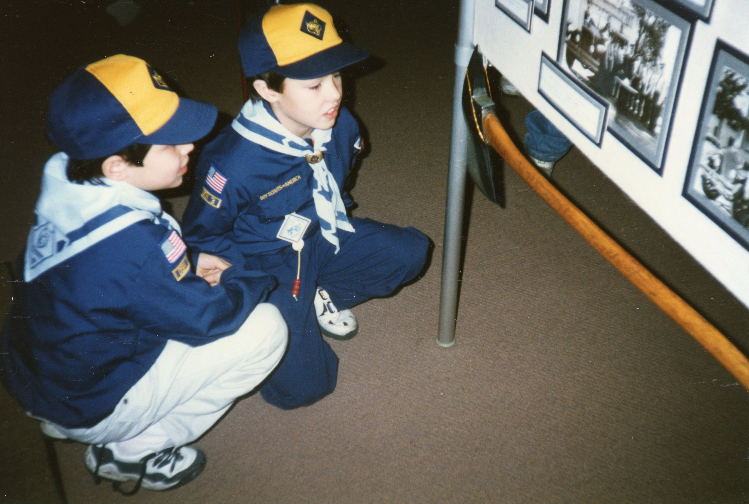 Julian Bermidez (L) and Andrew Crawford (R) Looking at an Old Axe Used by Fireman Years Ago