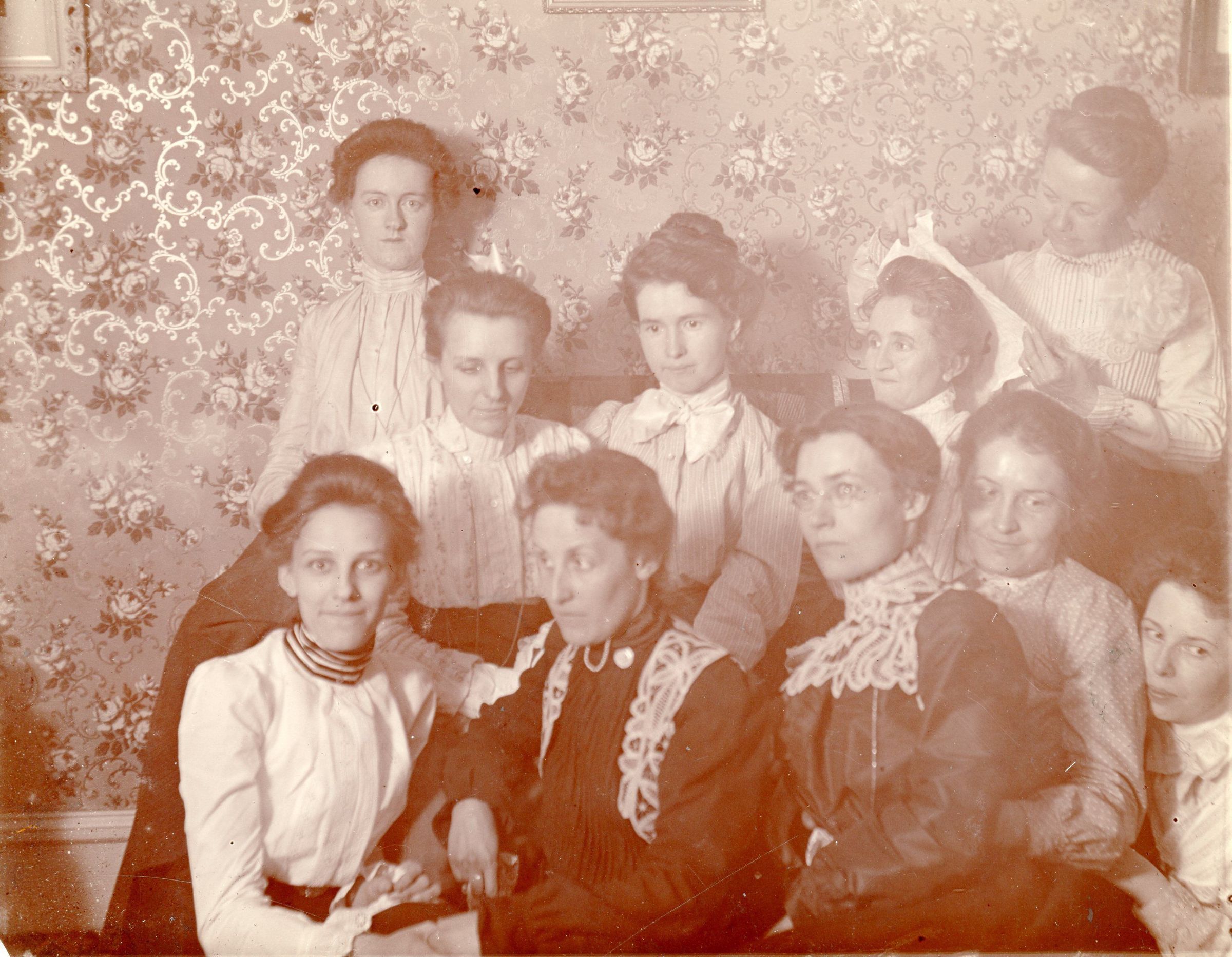Spinster Club Members. Back row Left to Right: Mr. Russel's Niece, Alice Cady, Nellie Freeman, Emma John and Ida Collar. Front row Left to Right: Anna Cady, Anna Chamberlain, Mammie Chaffee, Floy Warner and Lulu Blackmore.Cataloged By