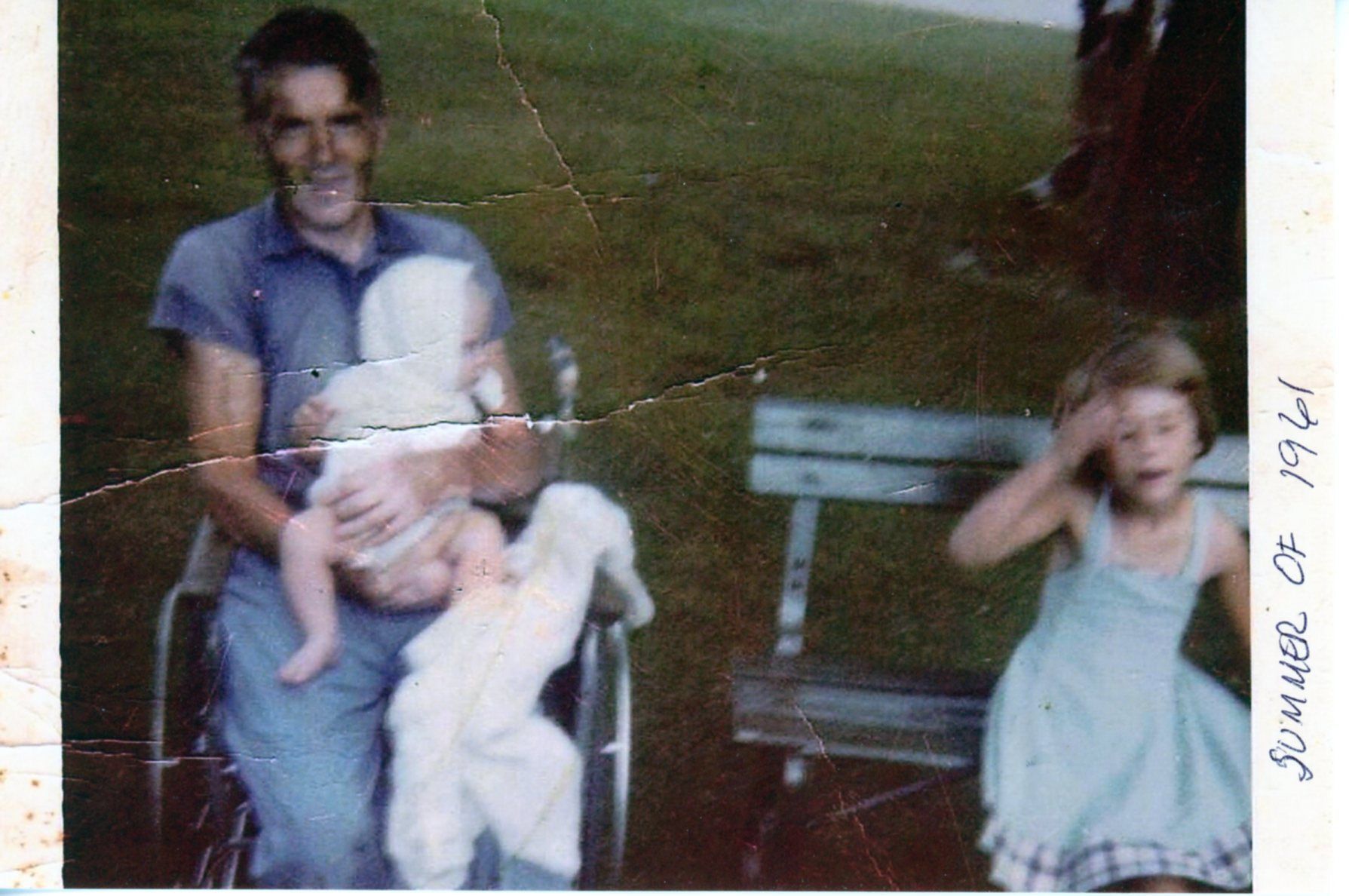 Patient George Bonk with his friends children Rana and Gus Joblinski outdoors for a visit. 1961Context