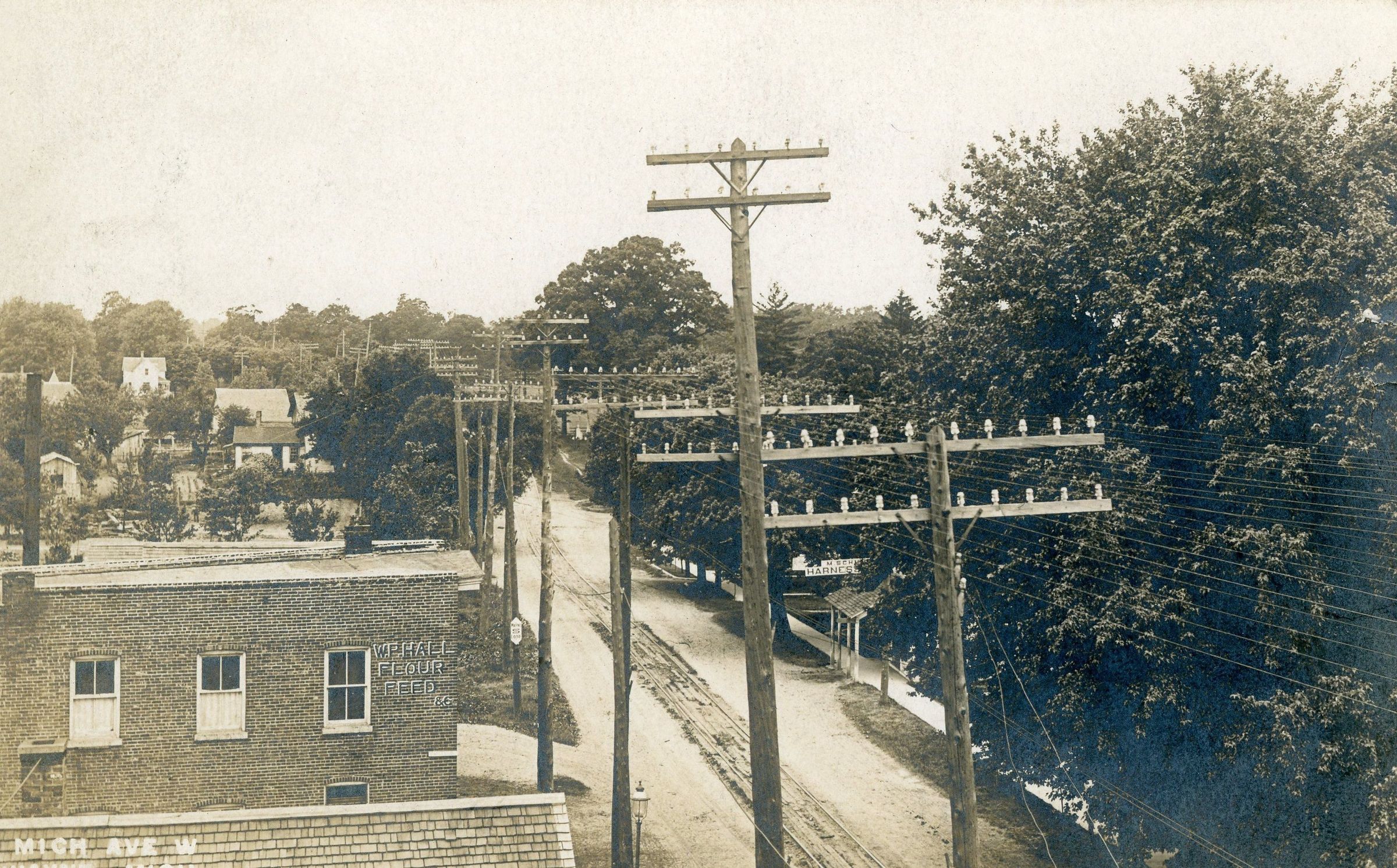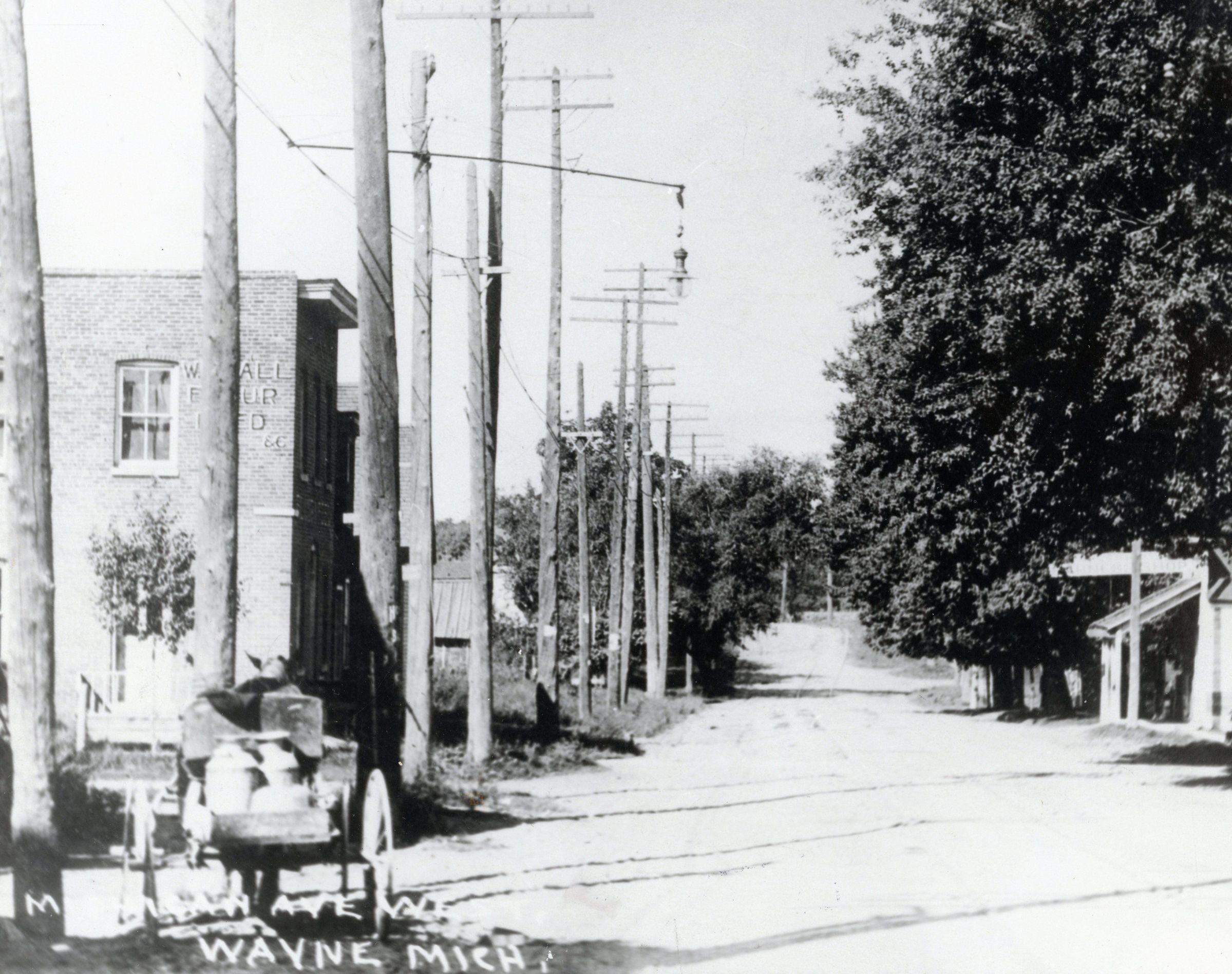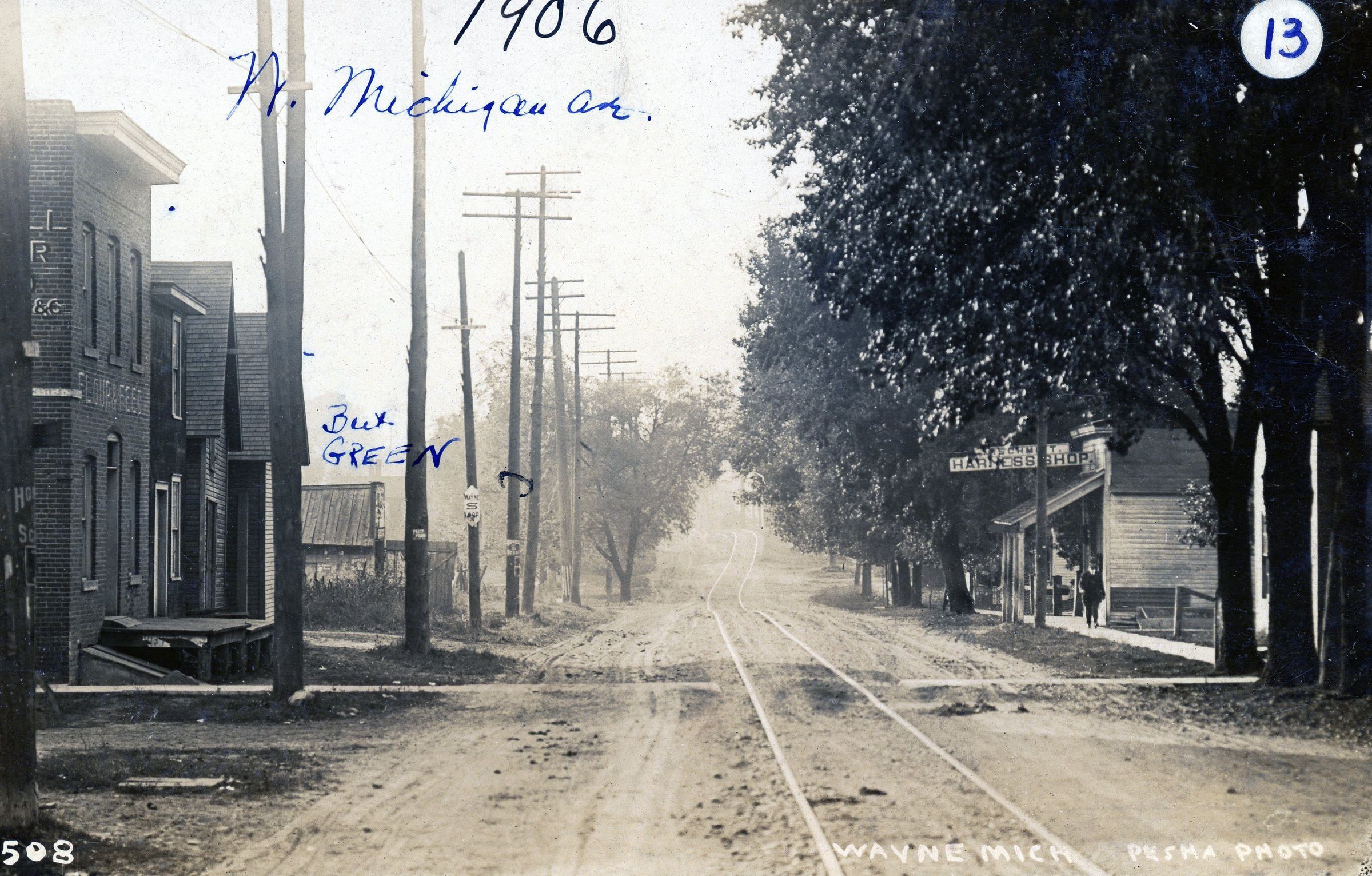 Michigan Avenue at Biddle looking West. 1906. William Hall's feed store at left, Schmidt's Harness shop on right.Cataloged By