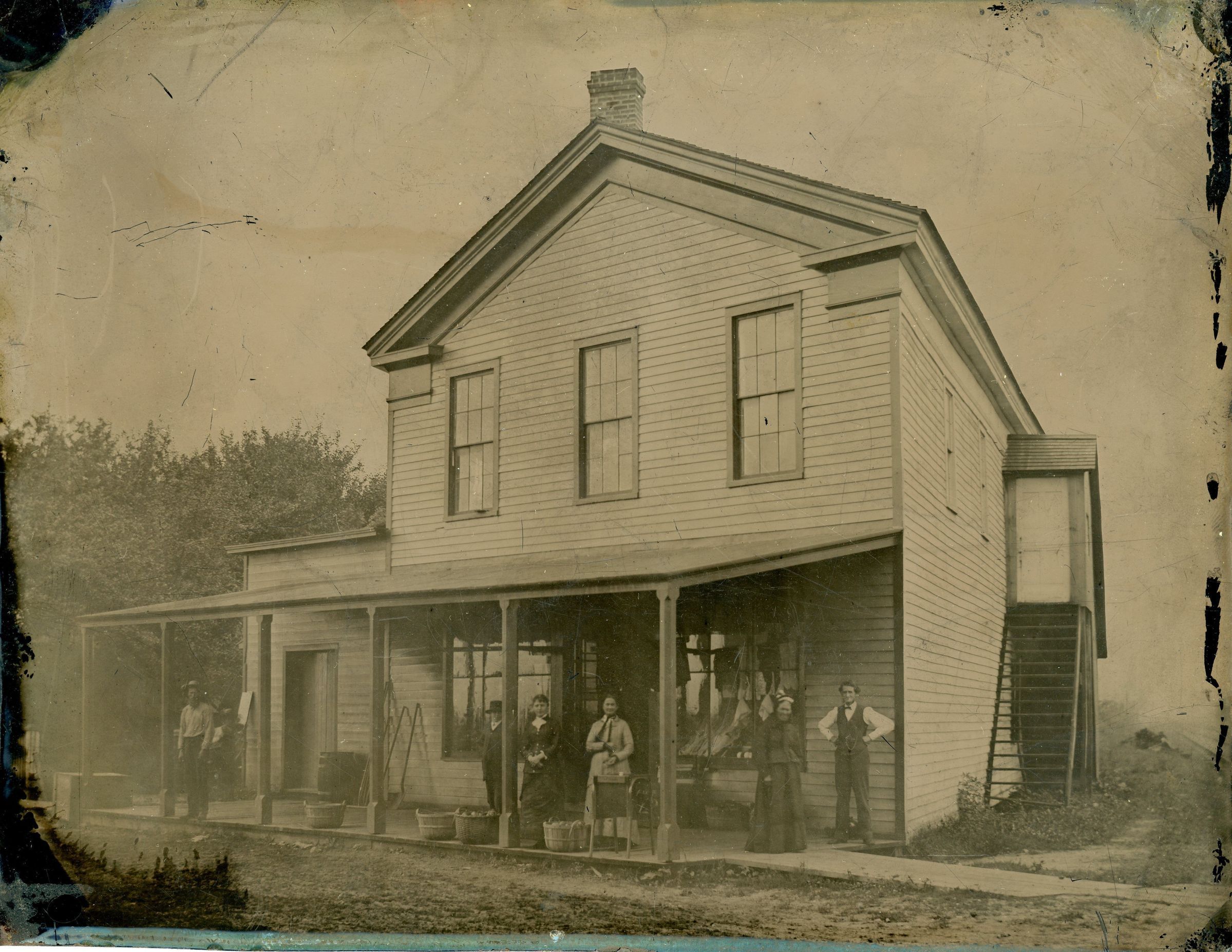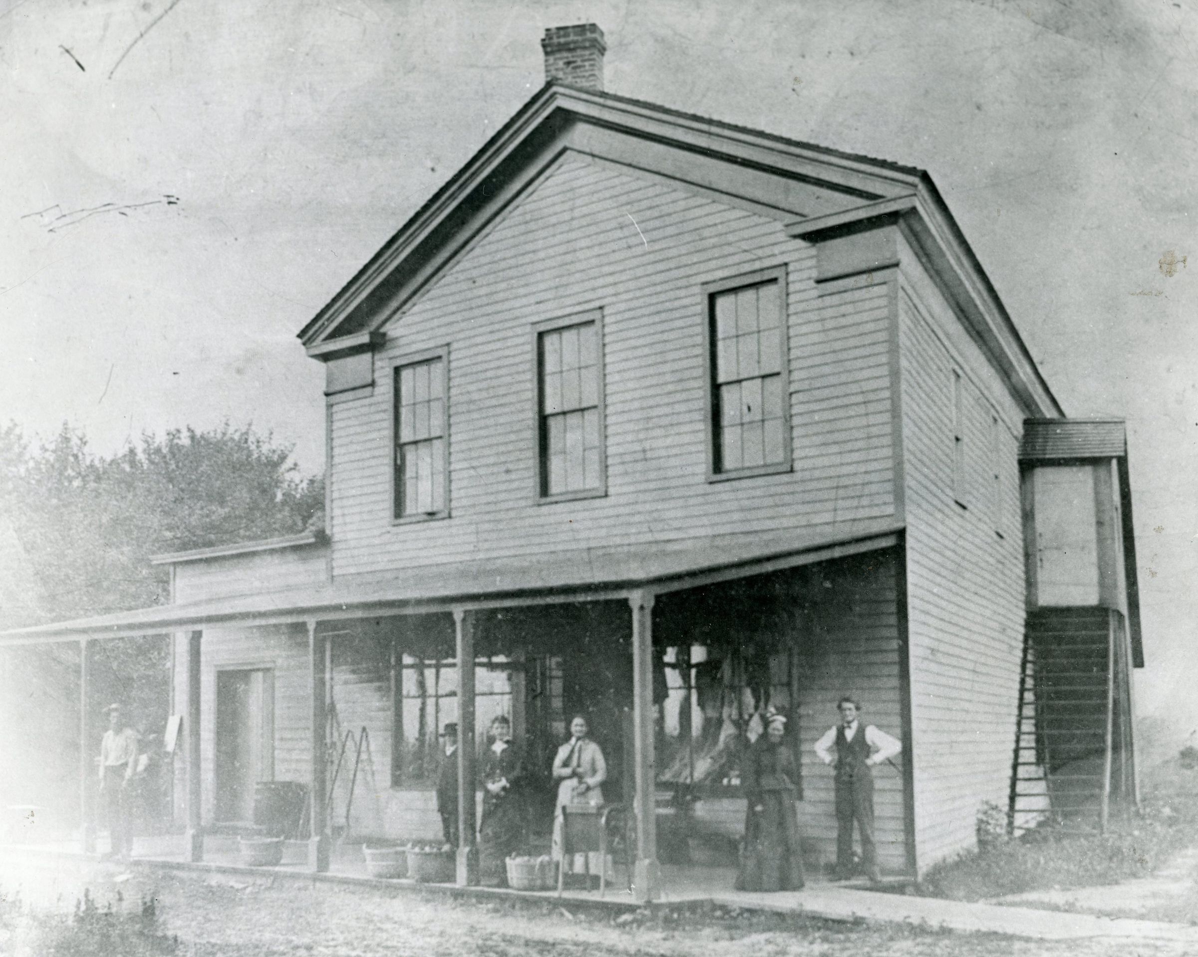 Jacob Bunting Store. West side of Wayne road just south of the tracks. Torn down sometime between 1900 and 1912. (L-R) Person at far left unknown. John Bunting, unknown, Kate Harrison Bunting, Mary Bunting, Jacob D. Bunting.Cataloged By