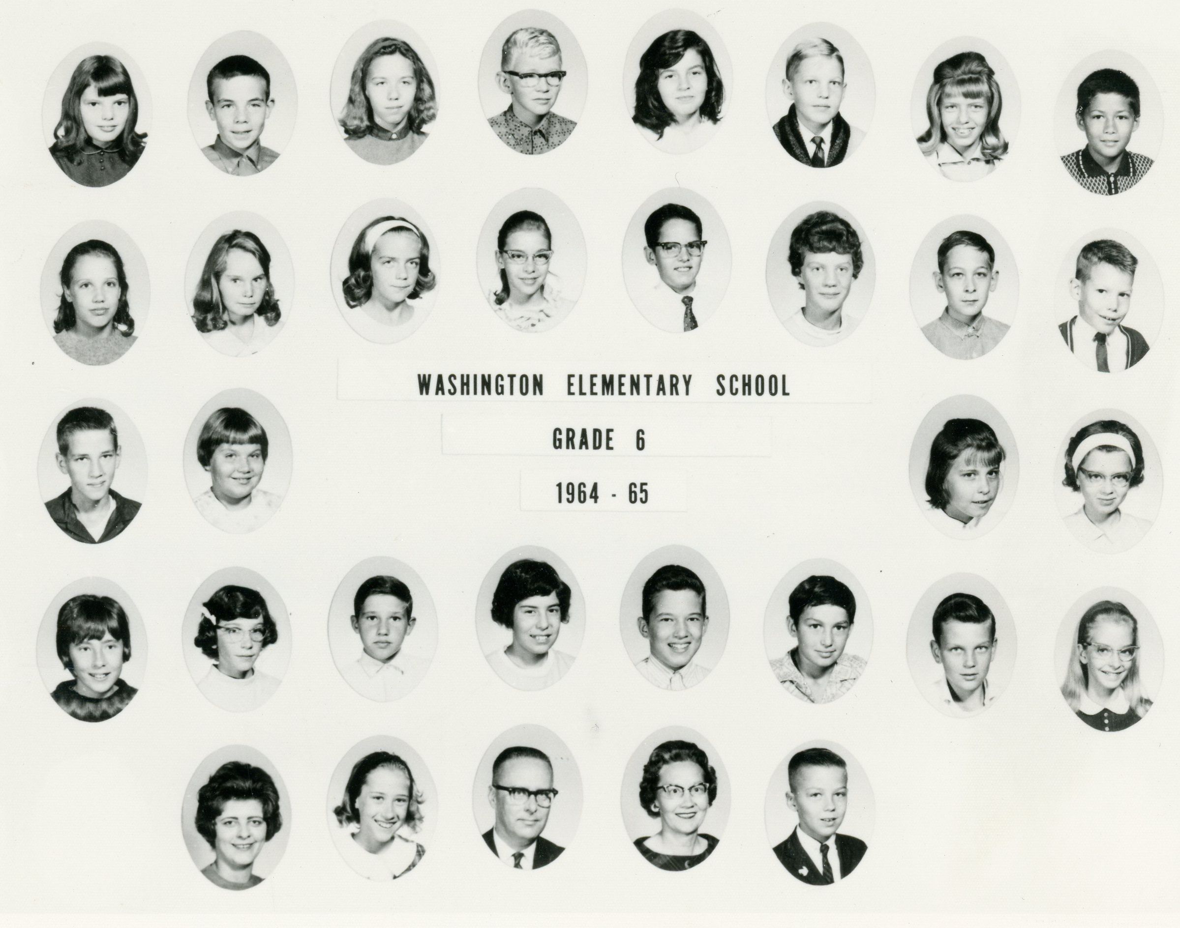 Washington School 6th grade class 1964-65. (L-R) Susan Henry, Ken Dietrich, Helene Hester, Jim Fowler, Laurie Krumbach, Bill Cline, Helen Leckemby, Joe Dornsen. Pamela Miller, Betty Blackburn, Susan Gates, Sharon Lohr, Dennis Nash, Connie Roach, Dan Hoover, Robert Fruit. Doug Truskowski, Linda Quinn, Alice Wass, Carolyn Tribble. Ann Marie O'Leary, Laurie Lloyd, Tony Roe, Susan Evanoff, Richard Sims, Jim Grassel, Gordon Henderson, Jocalyn Gills. Miss Lillian Brunsback (Student teacher), Martha Koveleski, Mr. Elander (Principal), Mrs. Myrna Smeltzer (Teacher), Myron TackettCataloged By