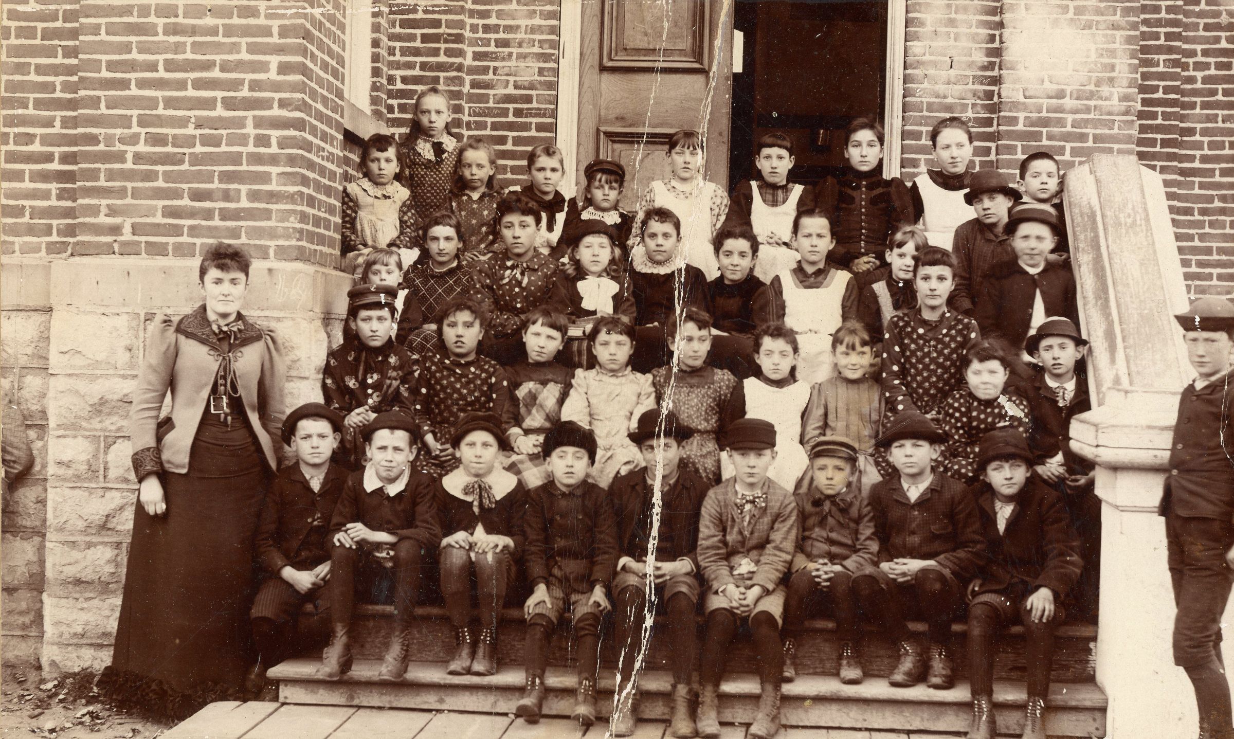 Wayne School Class Photo 1888. Teacher is Olivia Bryant. Tow row, L to R: Edith Hoops, May Curtis, H. Martin, Maude Squire, Elda or Ida Conklin, Gertie Mitchell, Tillie Thom, Julia Corkery and Ida Bertwer. 2nd Row: not recognized, Lena Wolf, Zoe Jacot, Freddie Damings, May Smith, Isabel Stellwagen, Ethel Egeler, Grace Temple, not recognized and not recognized. Third Row: Anna Sheldon, Mattie Counsellor, Nora Corkery, Myra Barnard, Clara Vogelbacher, Louise Stellwagen, Elsie Hubbard, Grace Counsellor, Vivian Gunn and not recognized. Bottom Row: Charles English, not recognized, not recognized, Orrin Beeman, John Krammerer, Nelson Chamberlain, Bradshaw Cady, James Austin, Carl Morison and John Mitchell.Cataloged By