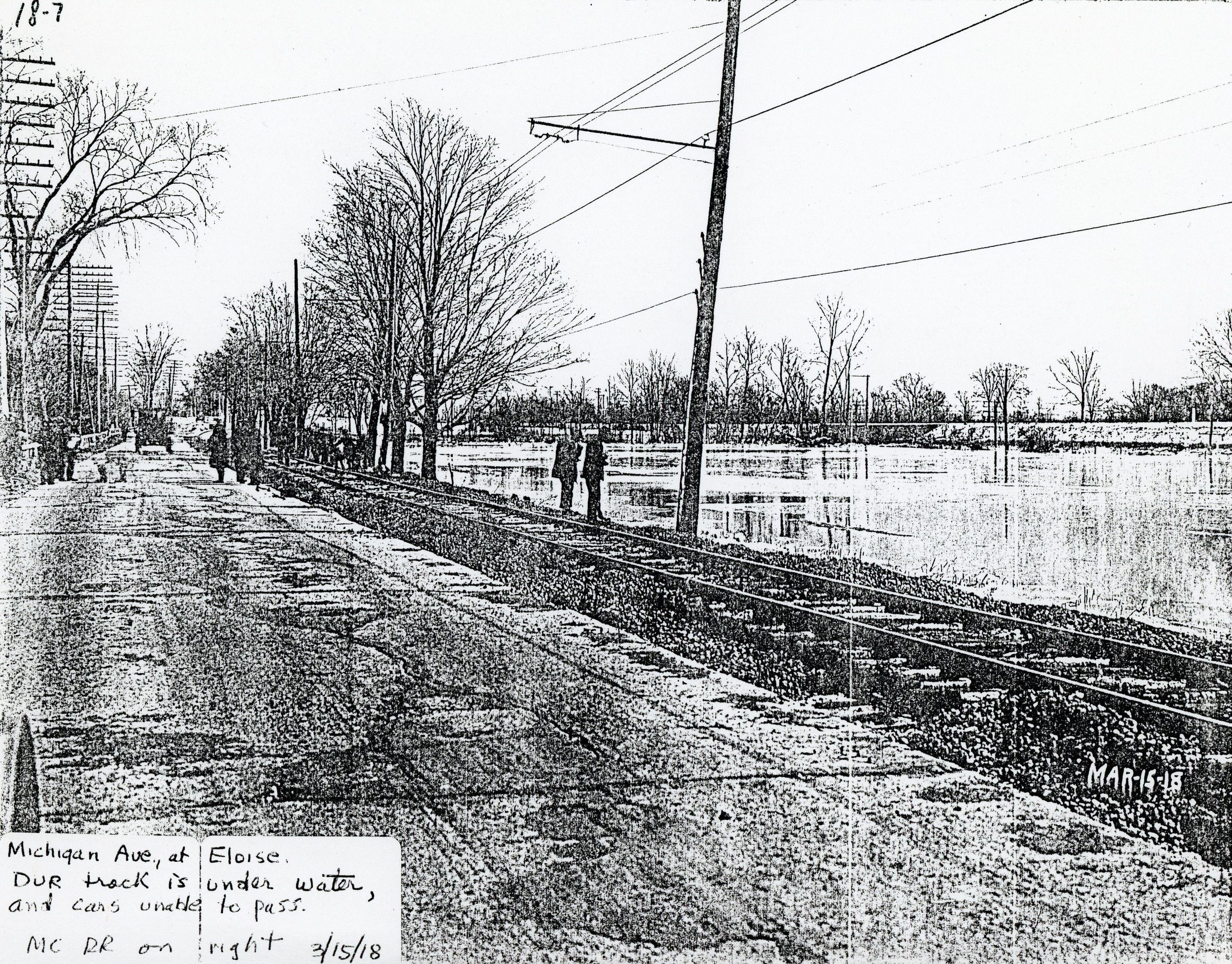 Michigan Avenue at Eloise. March 15, 1918. Flood covering the tracks, cars unable to pass.