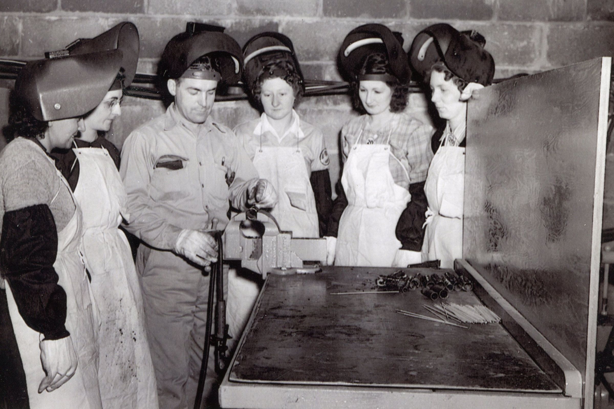 Dan Thomas teaching women to weld in the Wayne manufacturing complex. Women welders were needed because male welders were joining or being drafted in the Armed Forces. Dan Thomas was a master builder. Dan Managed the welding school from 1942 to 1945. He continued to work for Stinson until the factory closed in 1948.Cataloged By