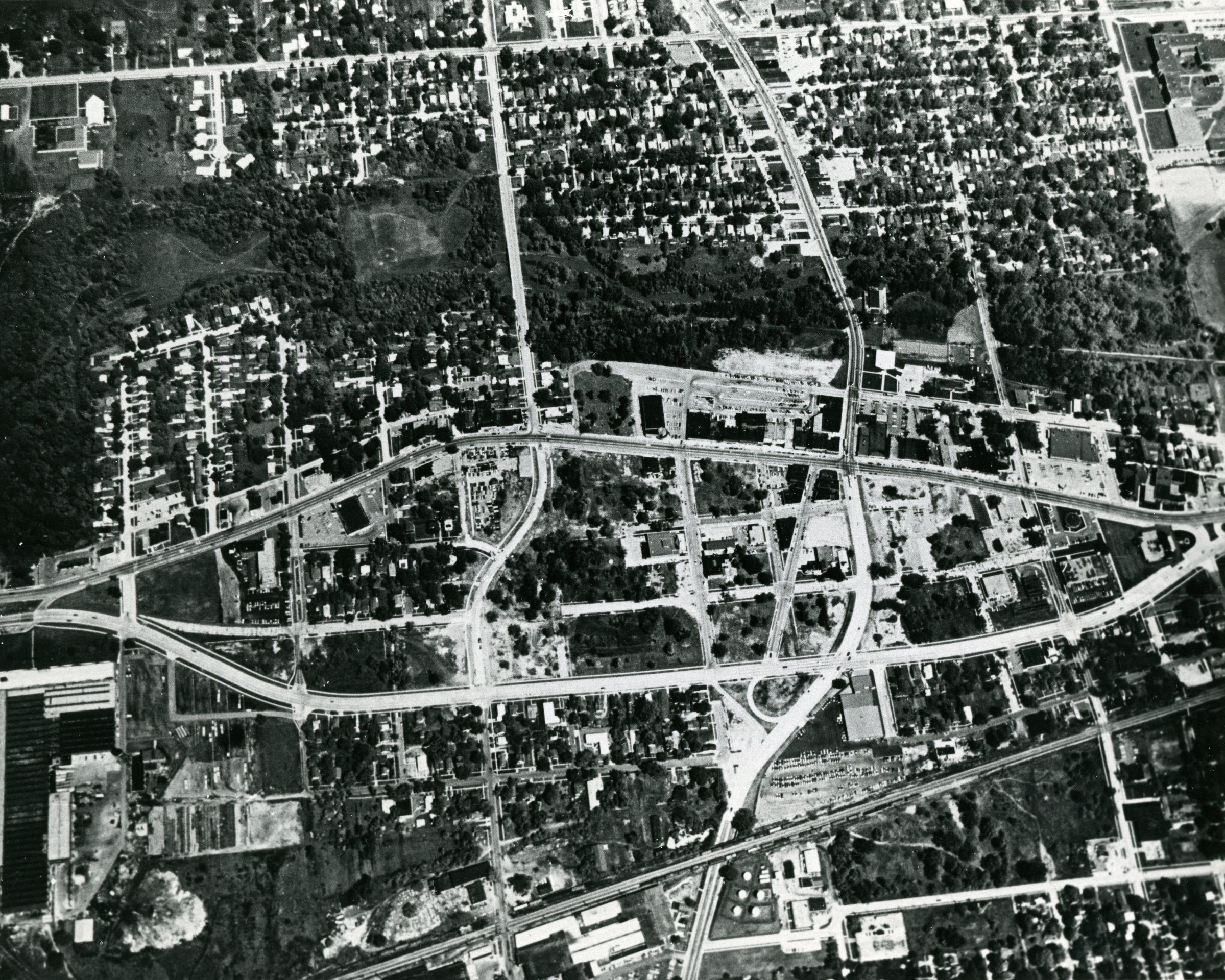 Over whole downtown looking North. Late 1960s. Norris has been made into Michigan Ave EB, and Wayne road curve is done. Monroe street not removed yet (1972). Urban Renewal.Cataloged By