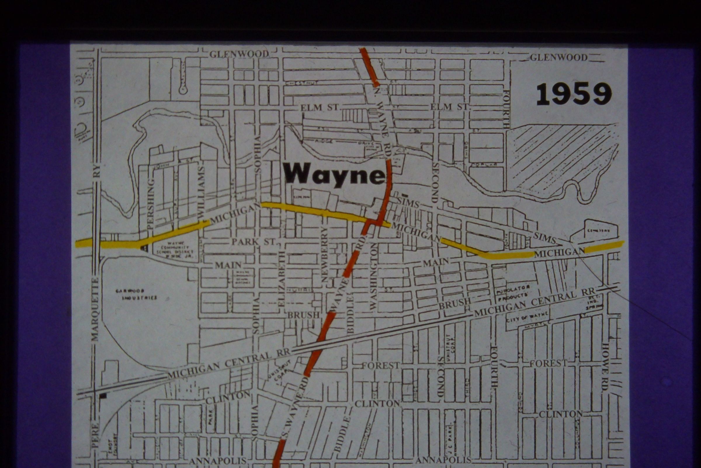 1959 Map of Wayne. Highlighting Wayne road and Michigan Avenue.