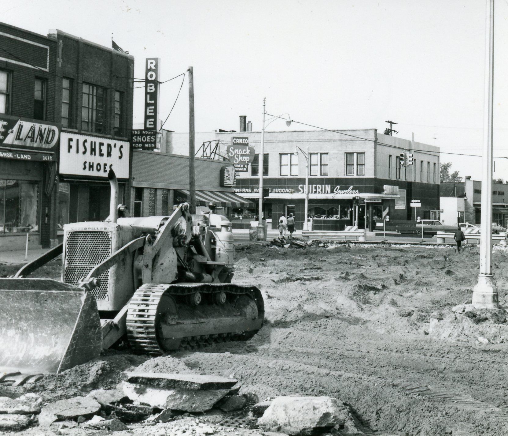 3616 & 3612 Wayne Road (Washington). Looking NW towards Michigan Ave. Road repaving 1969. Shoe land, Fishers Shoes, Roblee Shoes, Cameo Snack Shop, Shifrin Jewlers Visible.Cataloged By