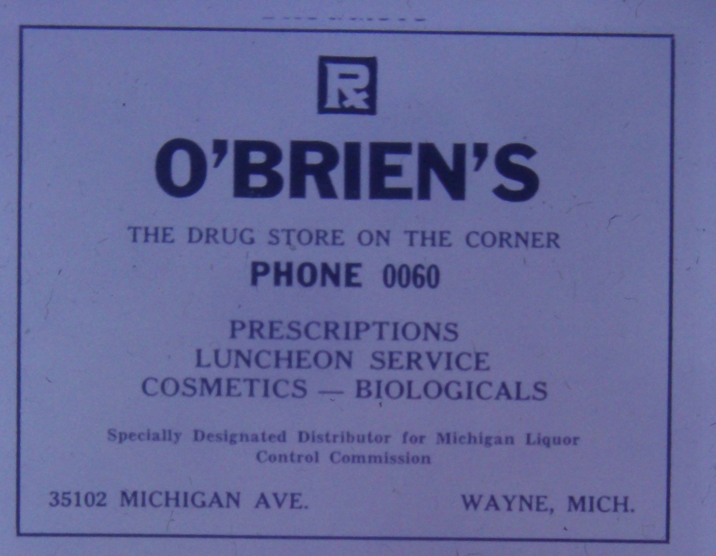 O'Brien's Drug Store, NW corner of Mich. and Wayne rd. Eagle photo