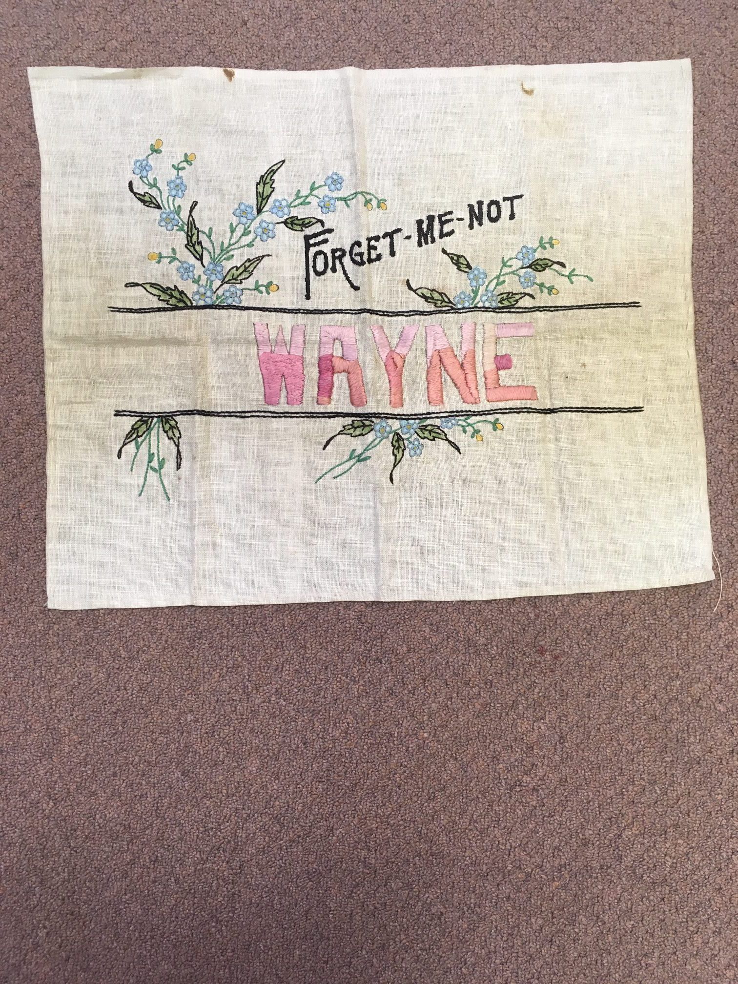 Embroidered fabric with stating forget-me-not Wayne with forget-me-not flowers surrounding the message.