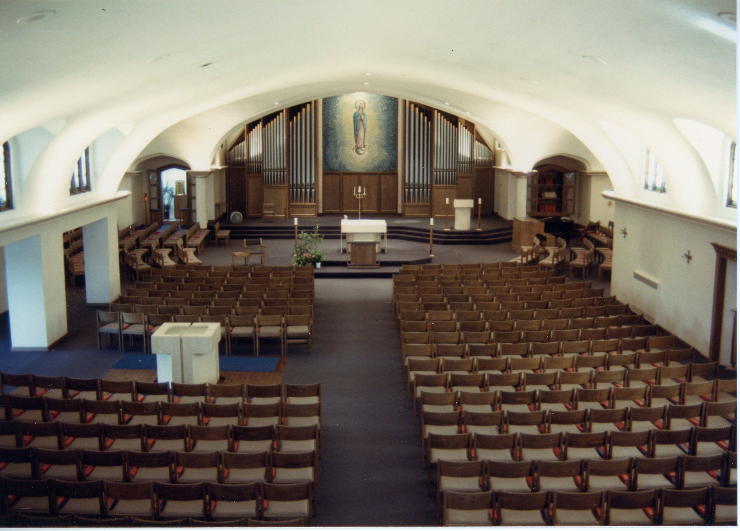 Altar with mosaic and organ visible